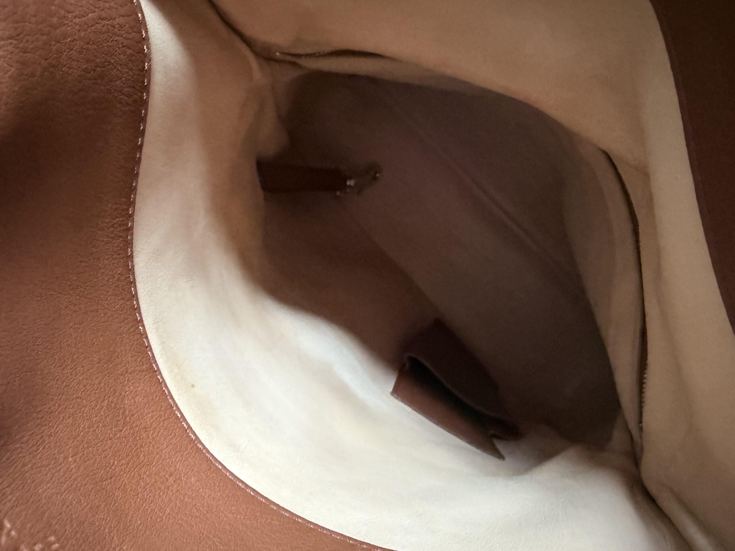 Het is een grote tas bestaande uit één groot compartiment die je dubbelvouwt en afsluit met een magnetische sluiting. Achteraan de tas heb je nog een apart compartiment met ritssluiting, gevoerd met toile de lin.