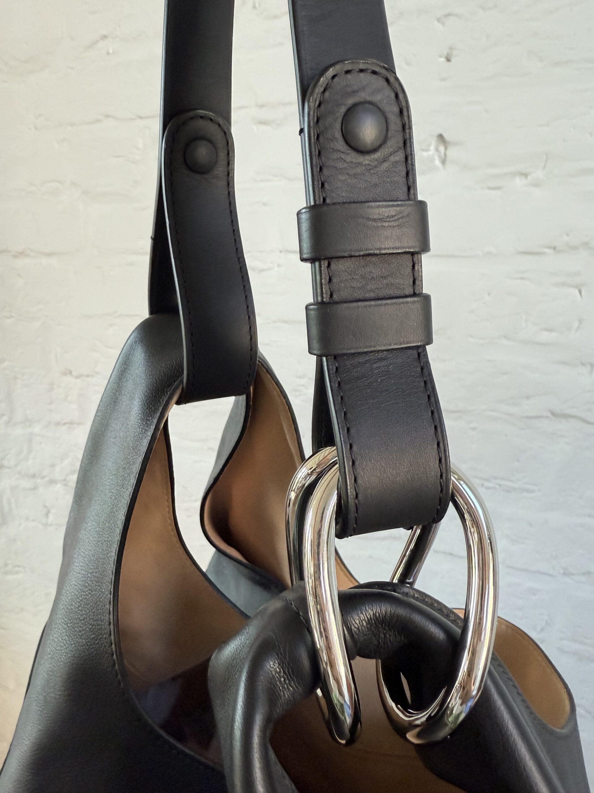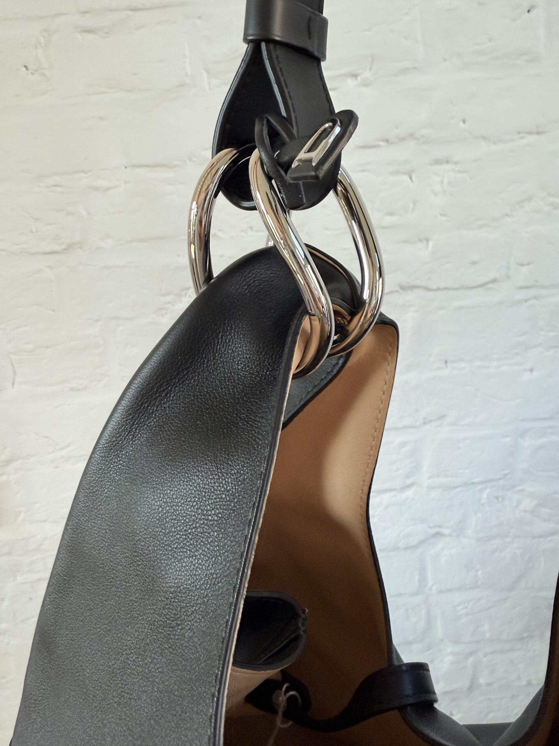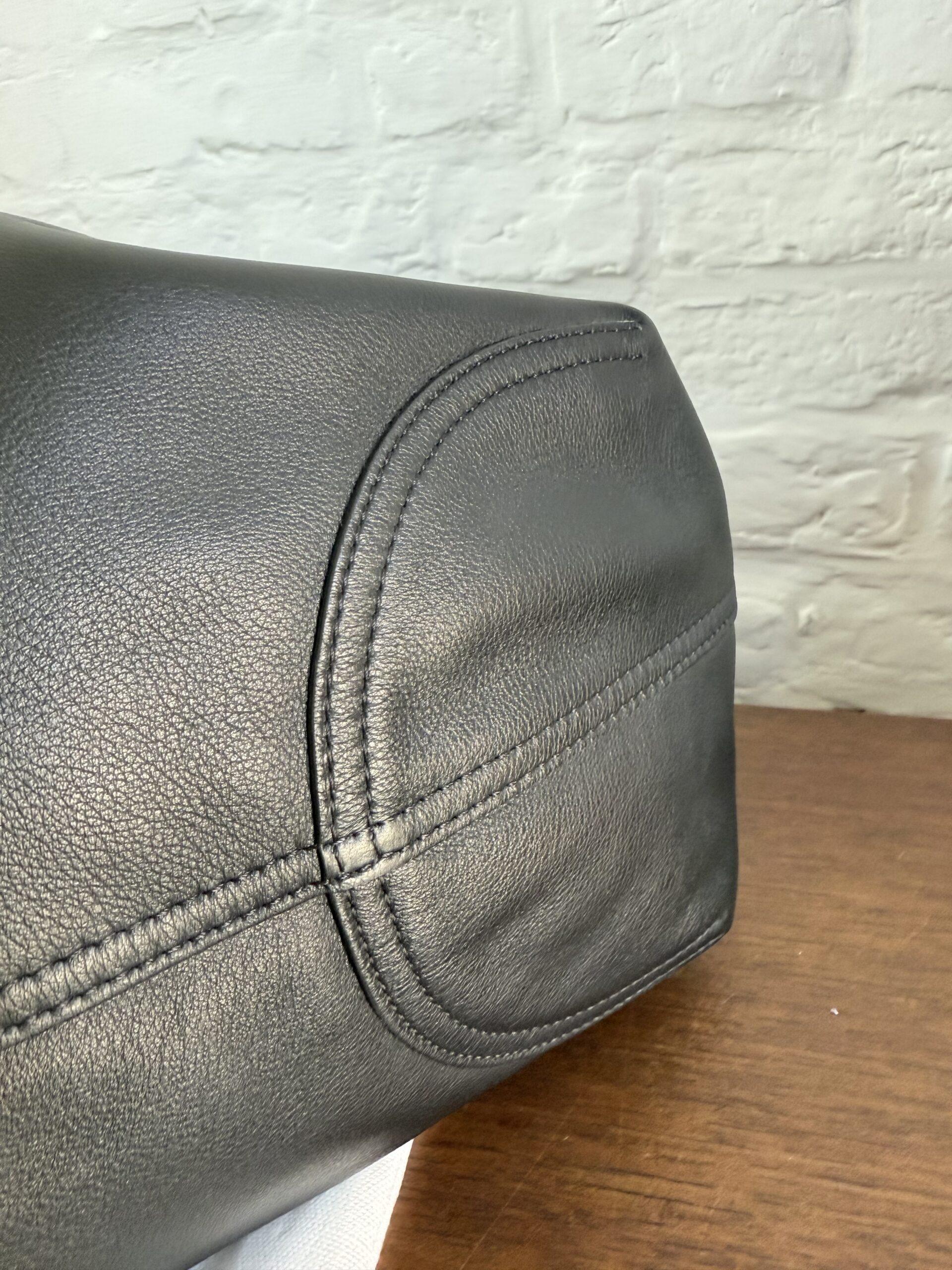 Uitgevoerd in calf souple in zwart met zilveren hardware.
