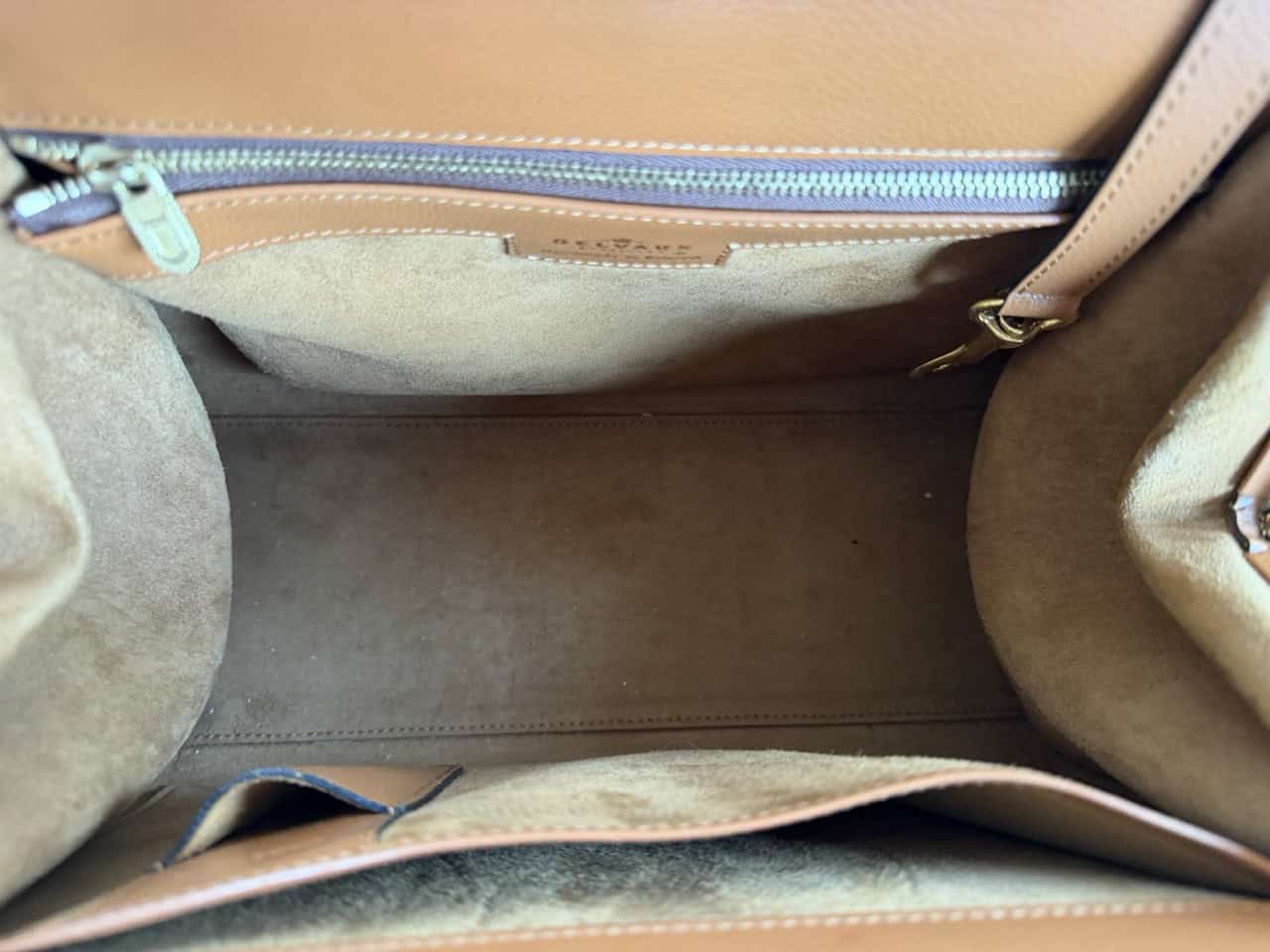 De binnenkant is gemaakt van bruin suède met een hoofdvak en meerdere zakken. Deze tas is ideaal voor een avondje uit of een formeel evenement.