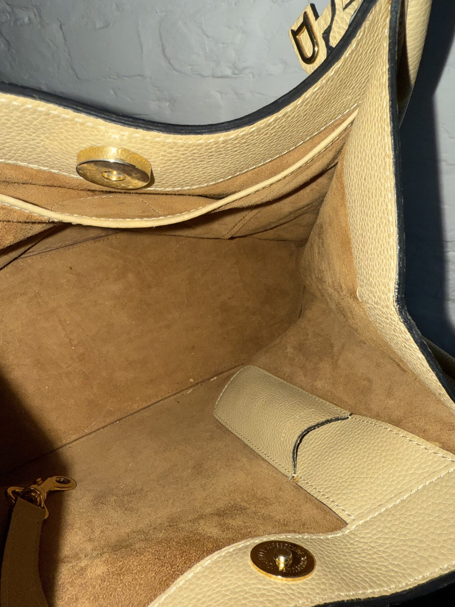 Je opent de tas met een magnetische knop naar een zeer ruim bruin suède interieur, waar nog een steekzakje zit.