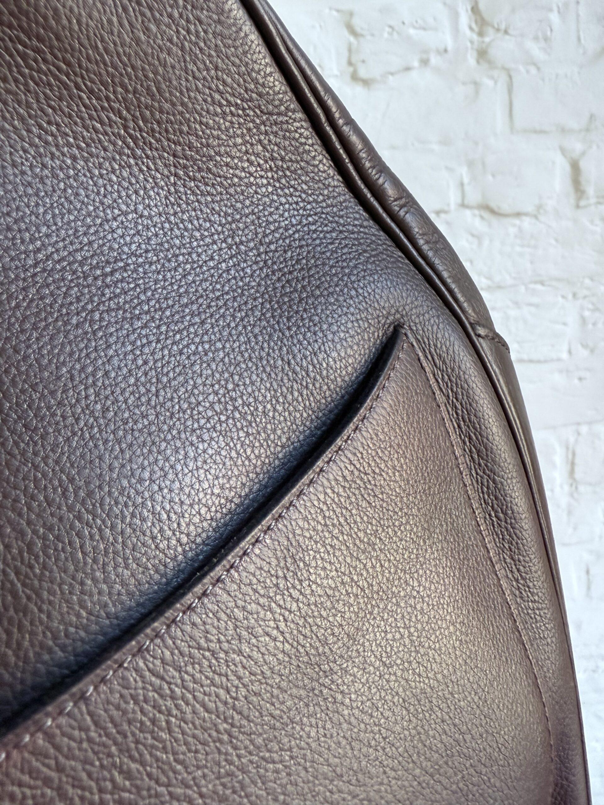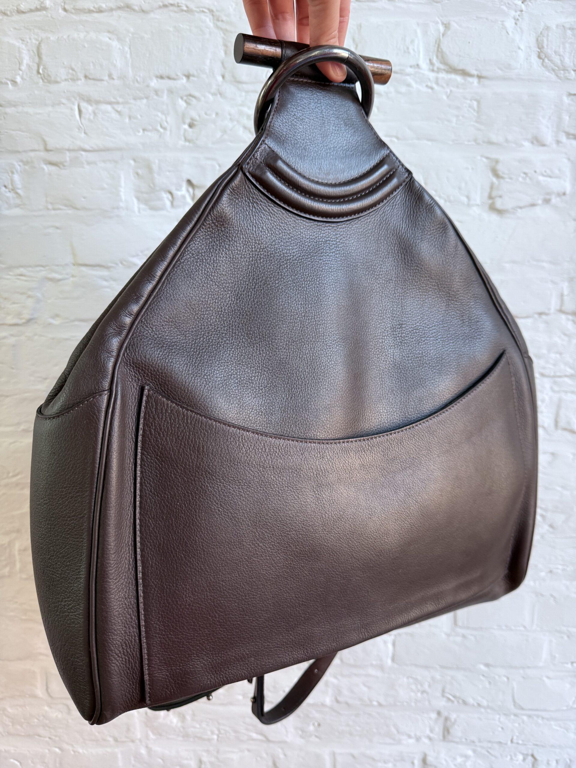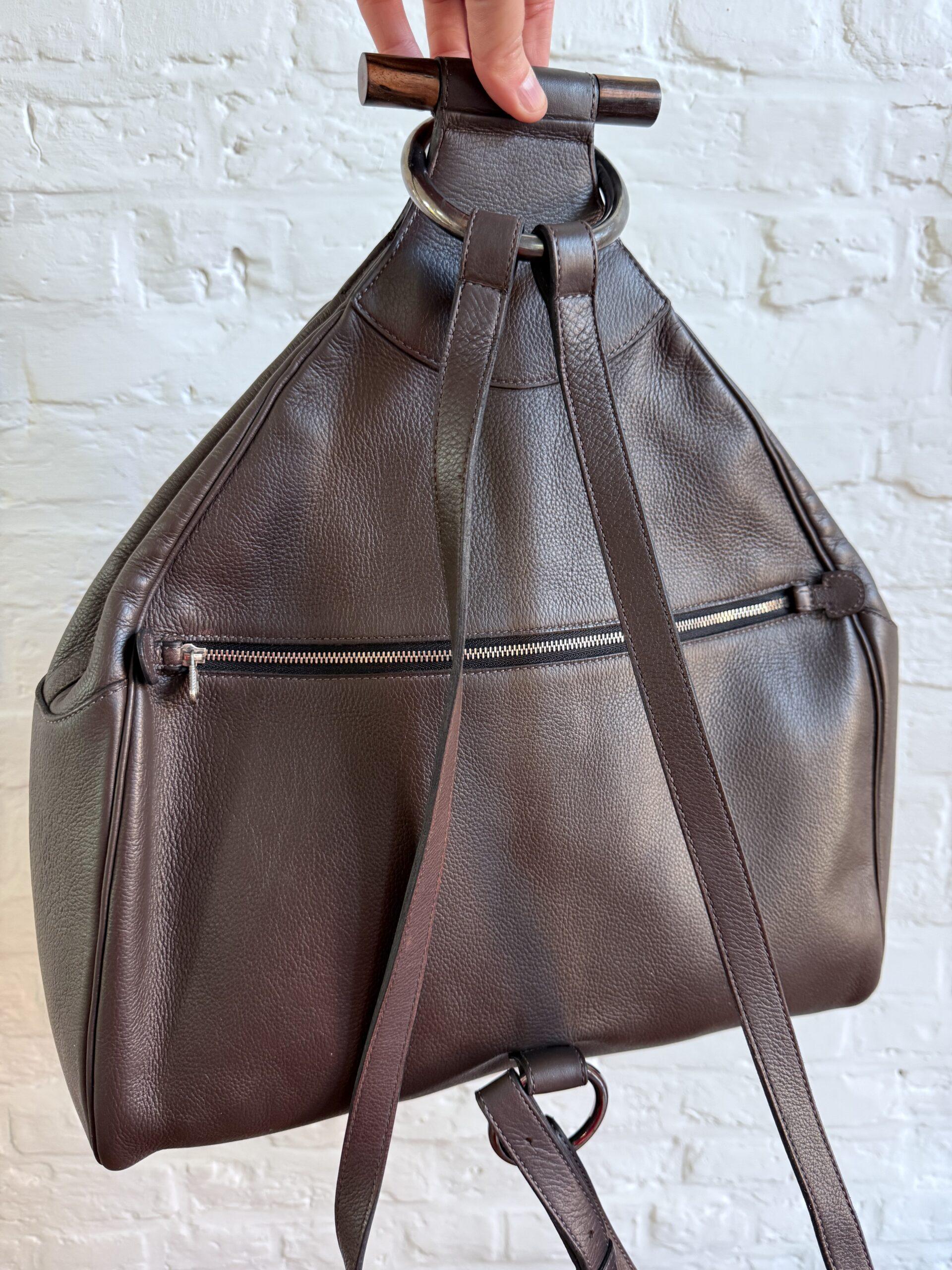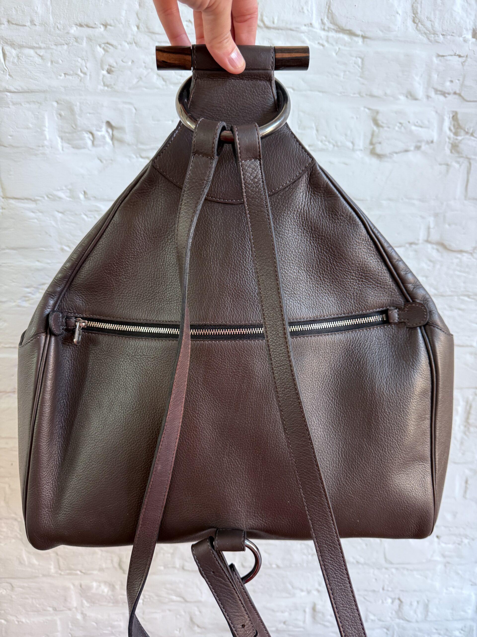 Een rugzakje in bruine jumping calf met mooie details (typisch delvaux!) in palladium en fineer.