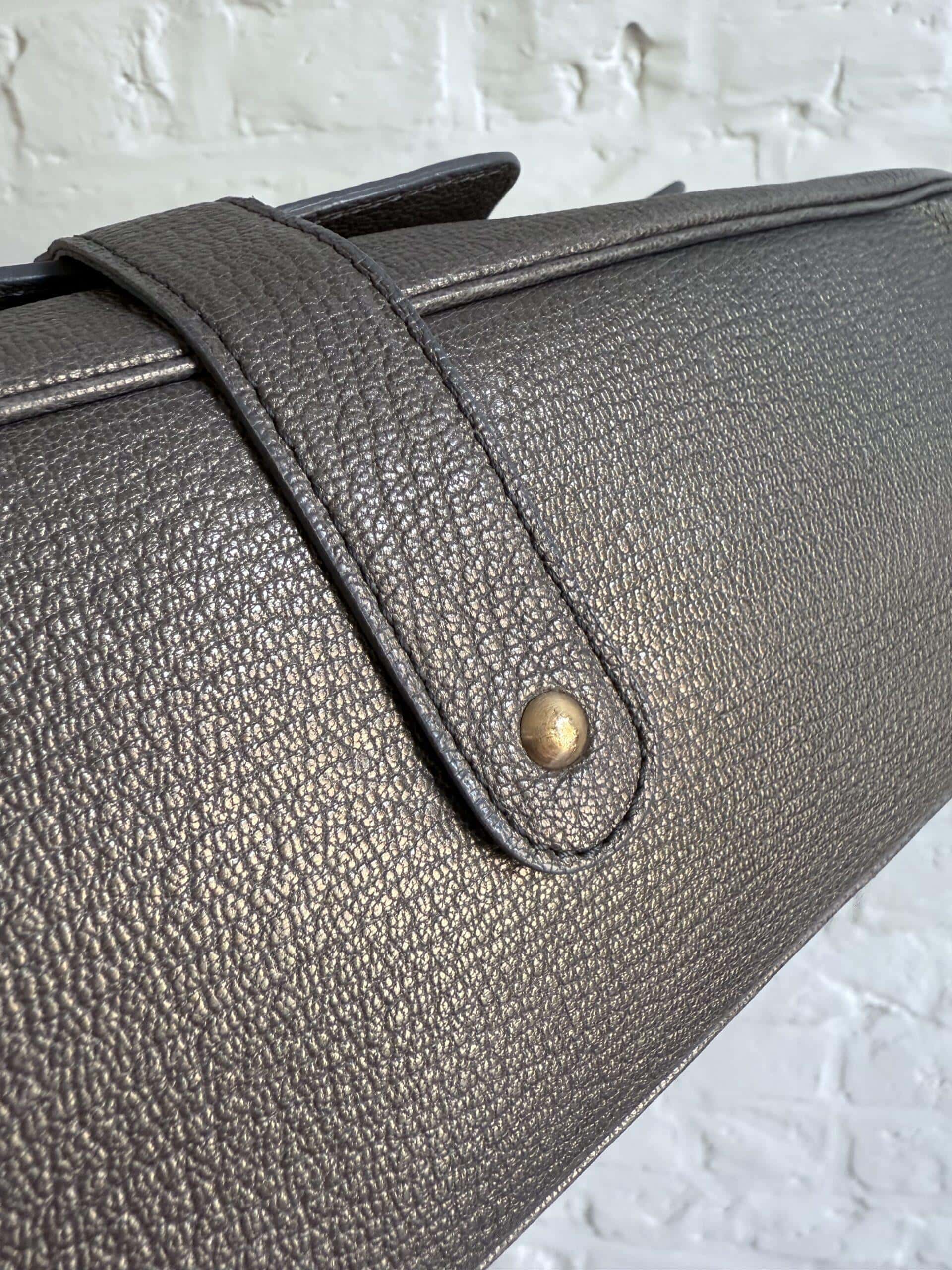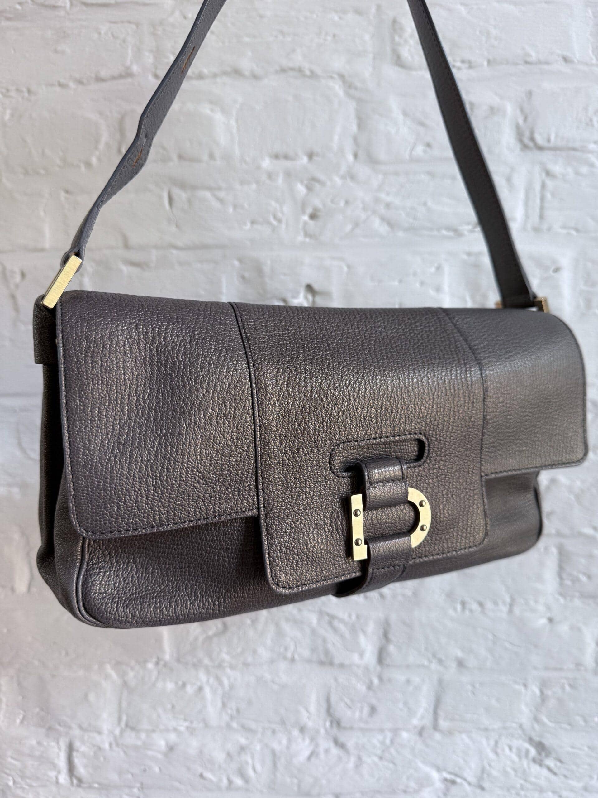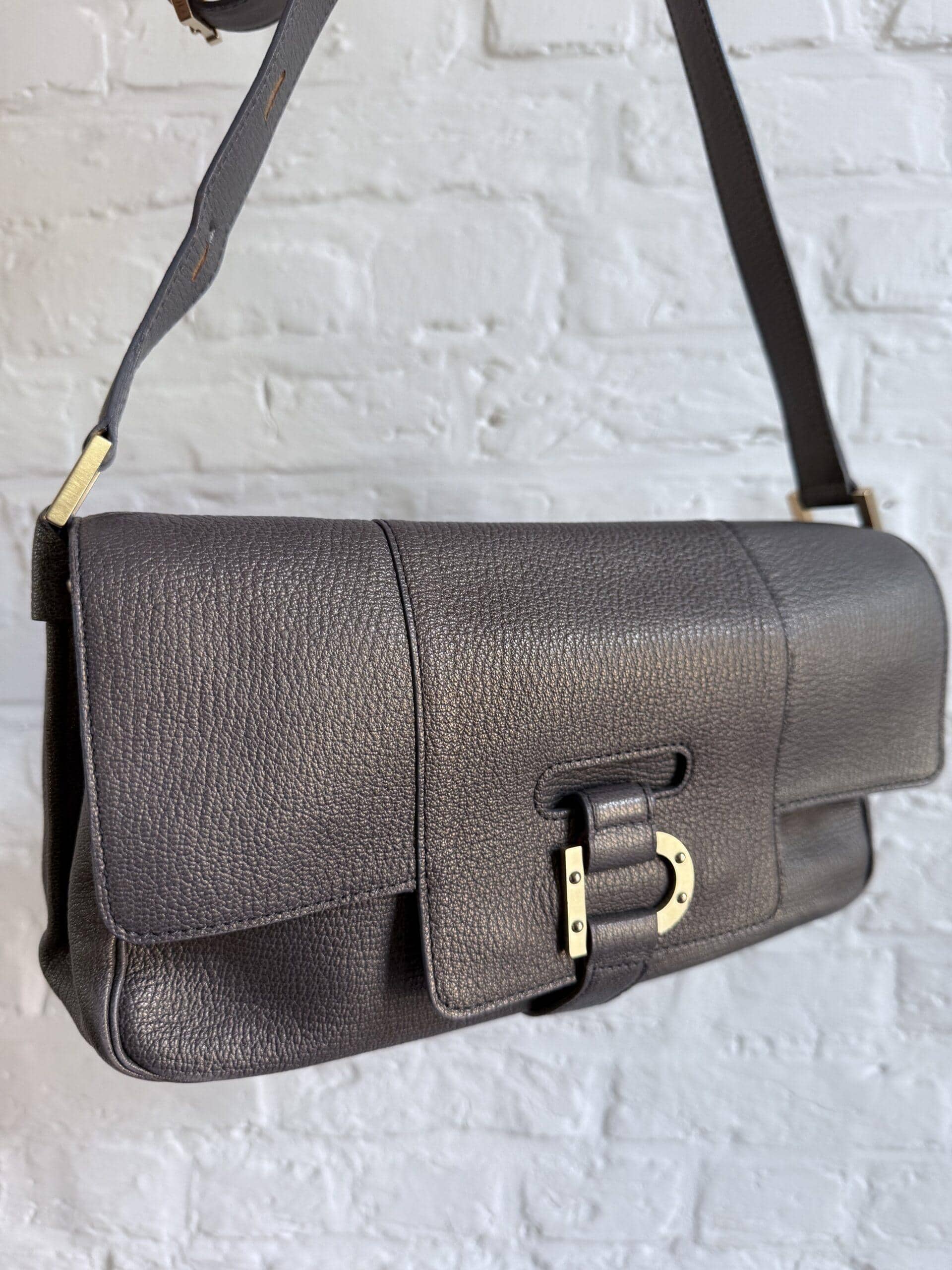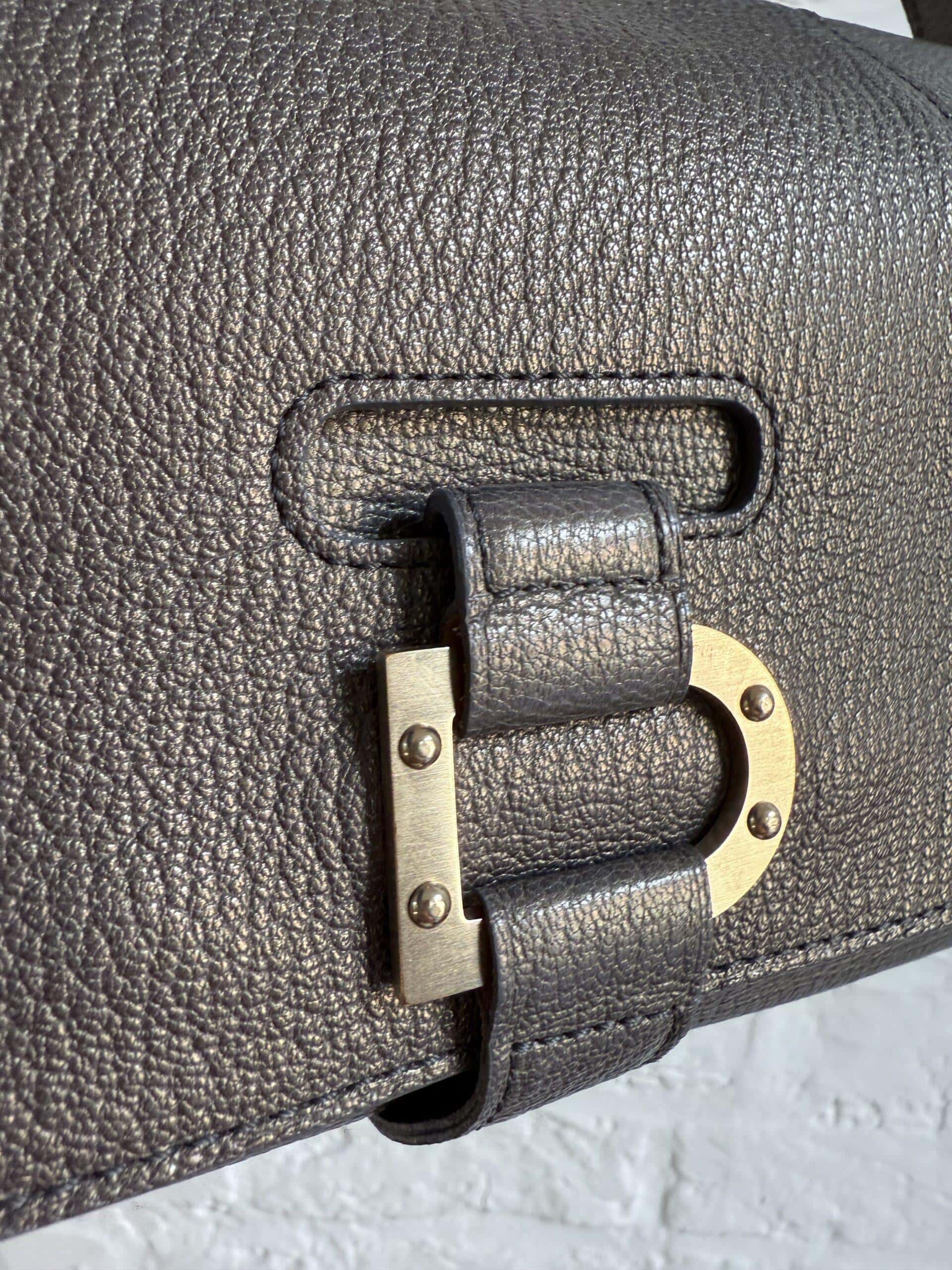 Een handige crossbody uitgevoerd in shimmery grijs geitenleder en afgewerkt met waanzinnige details.
