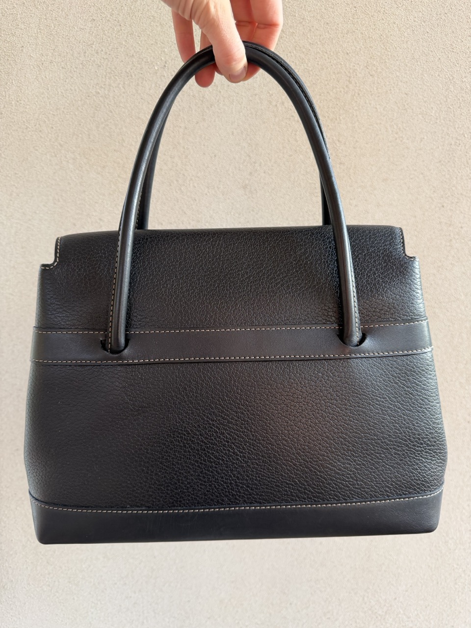 Deze ruime schoudertas komt in Zwarte jumping calf en is afgewerkt met details in boxcalf.