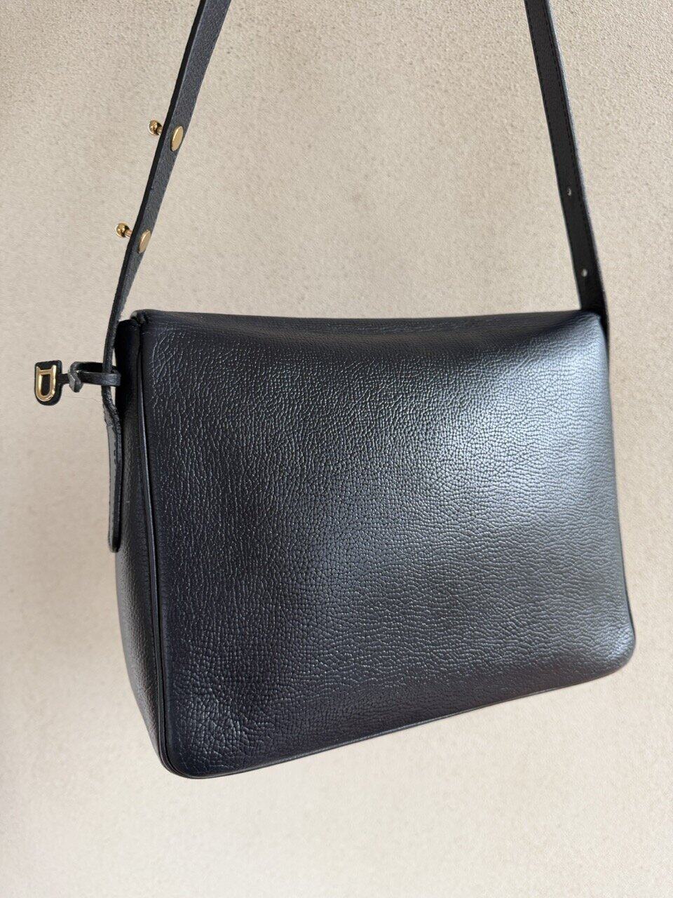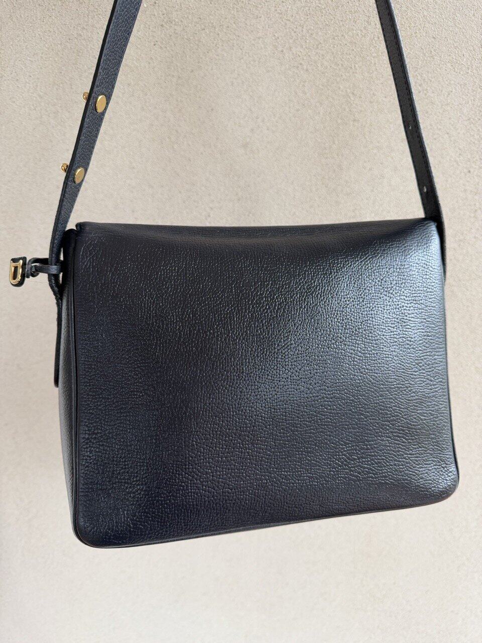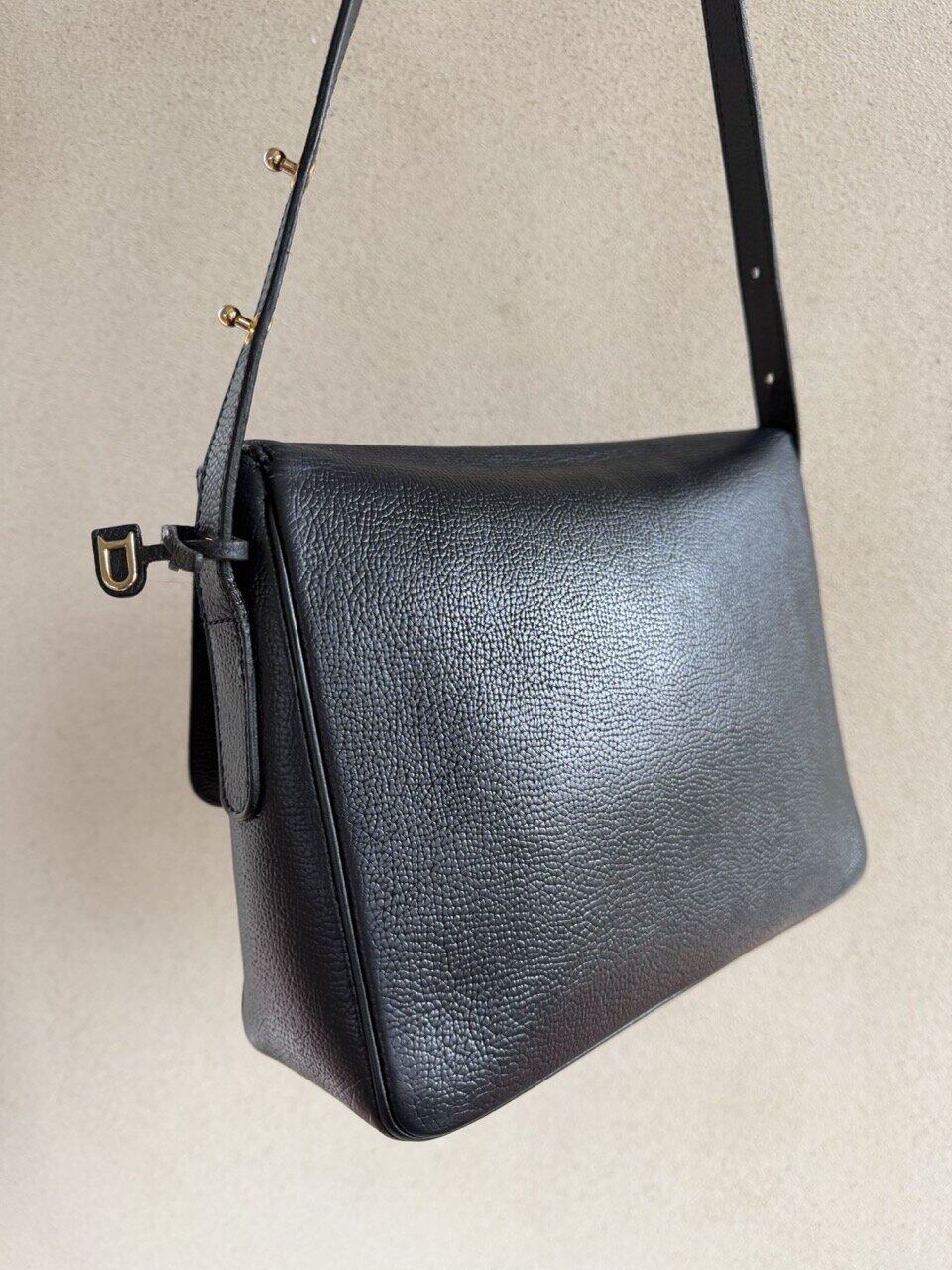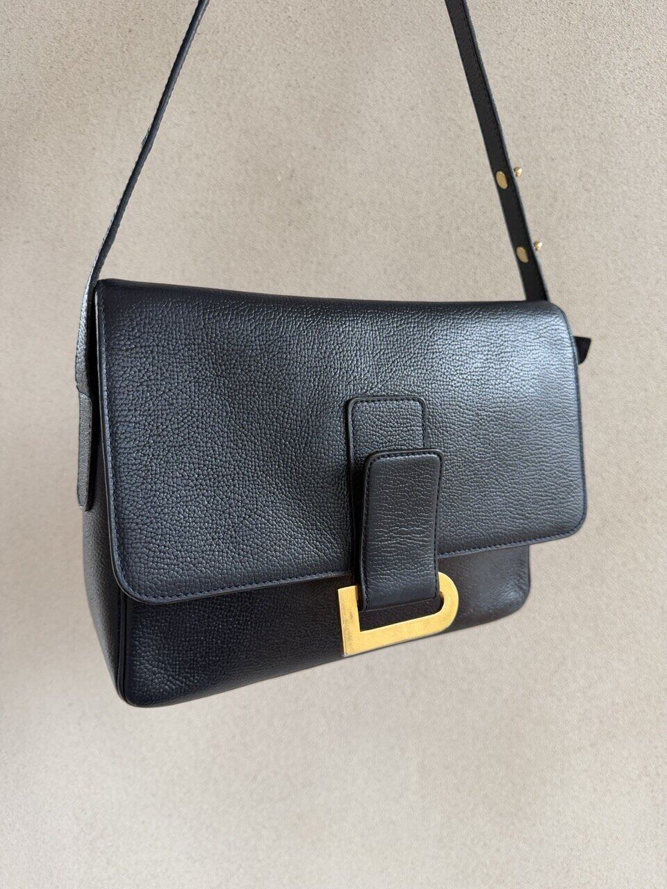 De allerhandigste crossbody van Delvaux is te verstellen in lengte met geweerknopjes, waardoor hij eveneens op schouderlengte kan worden gedragen. Hij bestaat uit één groot compartiment met en apart ritszakje.