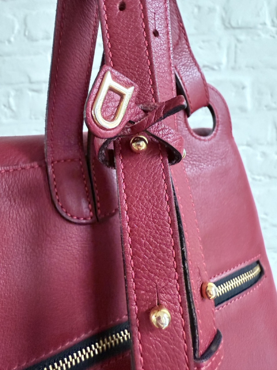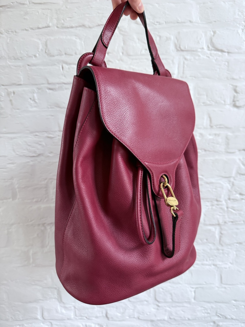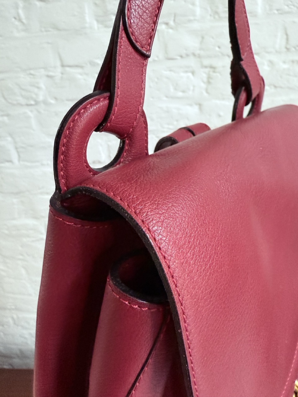 De uitvoering is in Rosso jumping calf en de hardware komt in het goud. De riemen zijn verstelbaar en het zakje vederlicht. Hebbeding!
