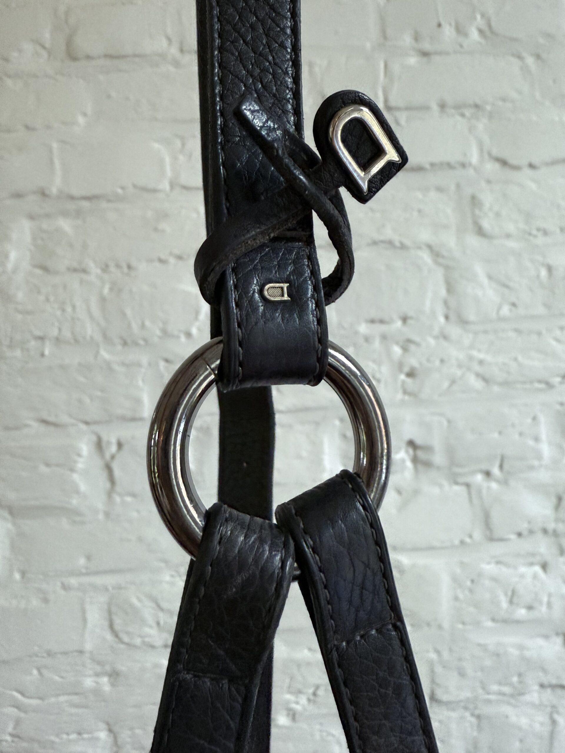 De strap – schouderband- is aanpasbaar en kan je naar keuze vooraan aan de gleuf of onderaan in het oogje bevestigen.