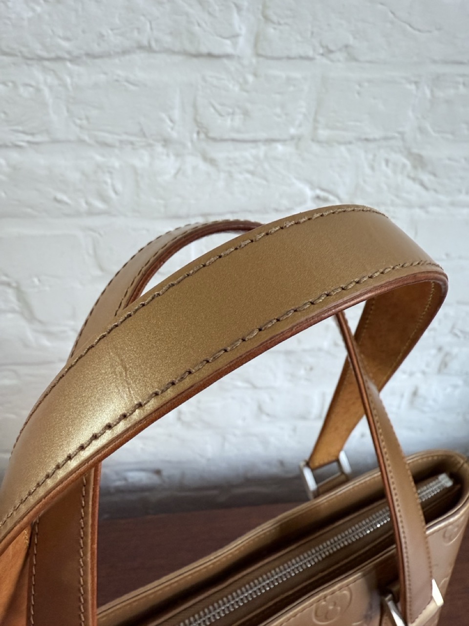 De dubbele handvaten zijn afgewerkt in in hetzelfde amber kalfsleder + aan de binnenzijde met vachettaleder.