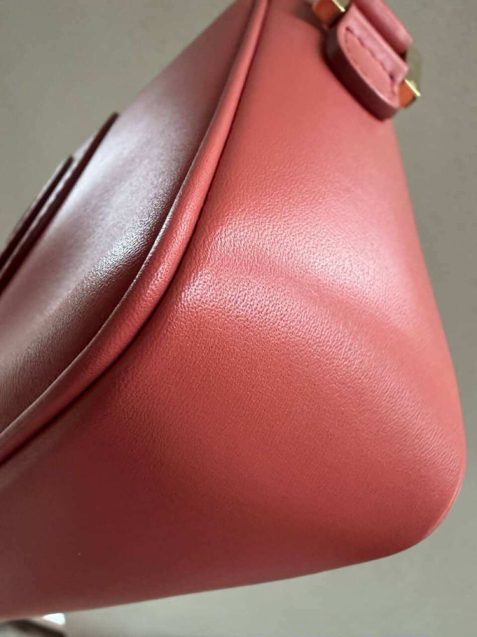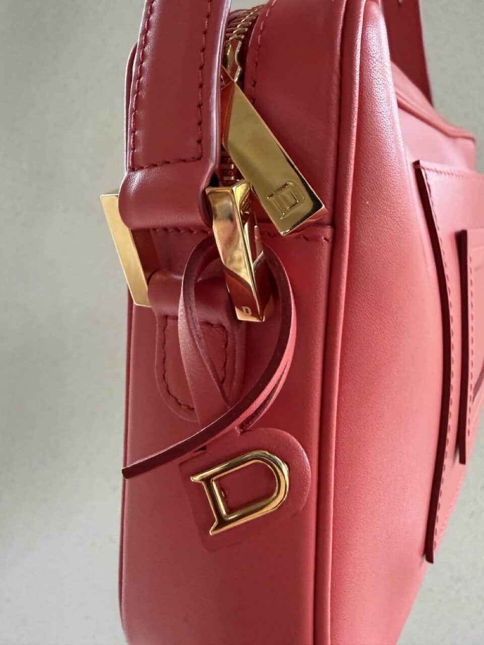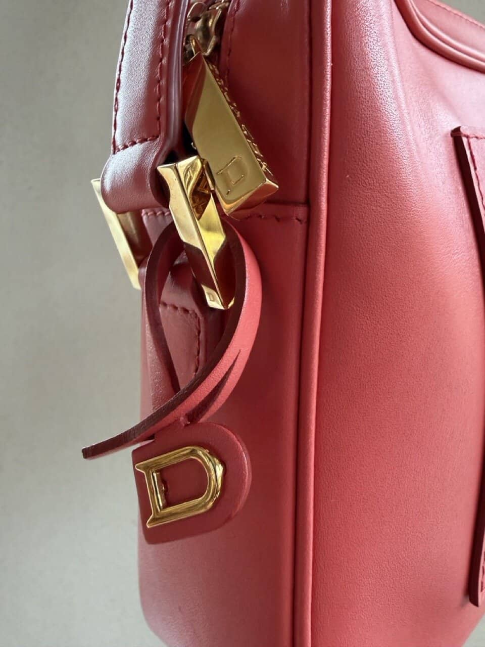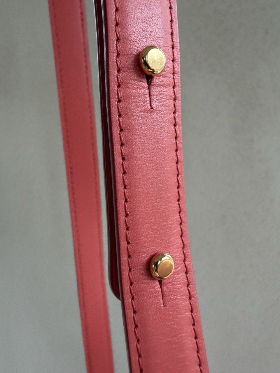 Ze komt in een zachte koraalkleur en gouden hardware en verkeert in complete nieuwstaat.