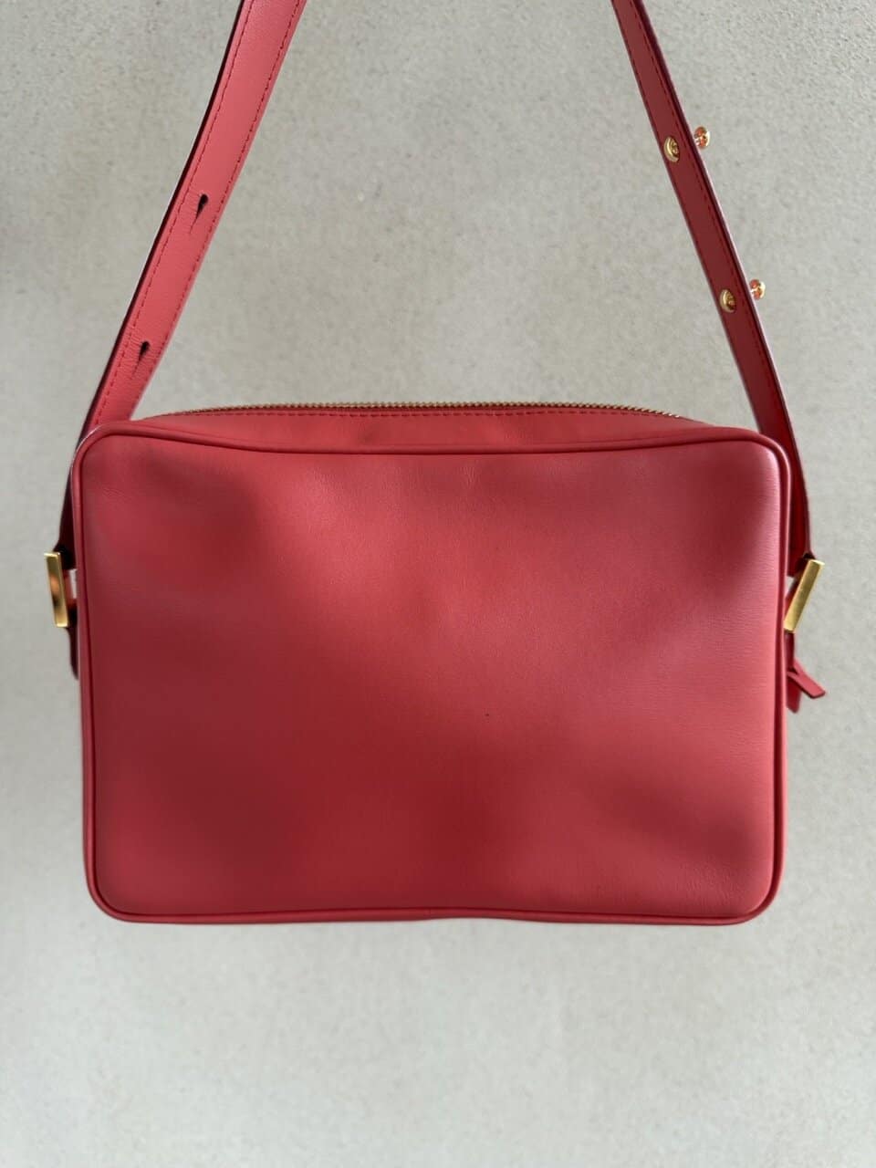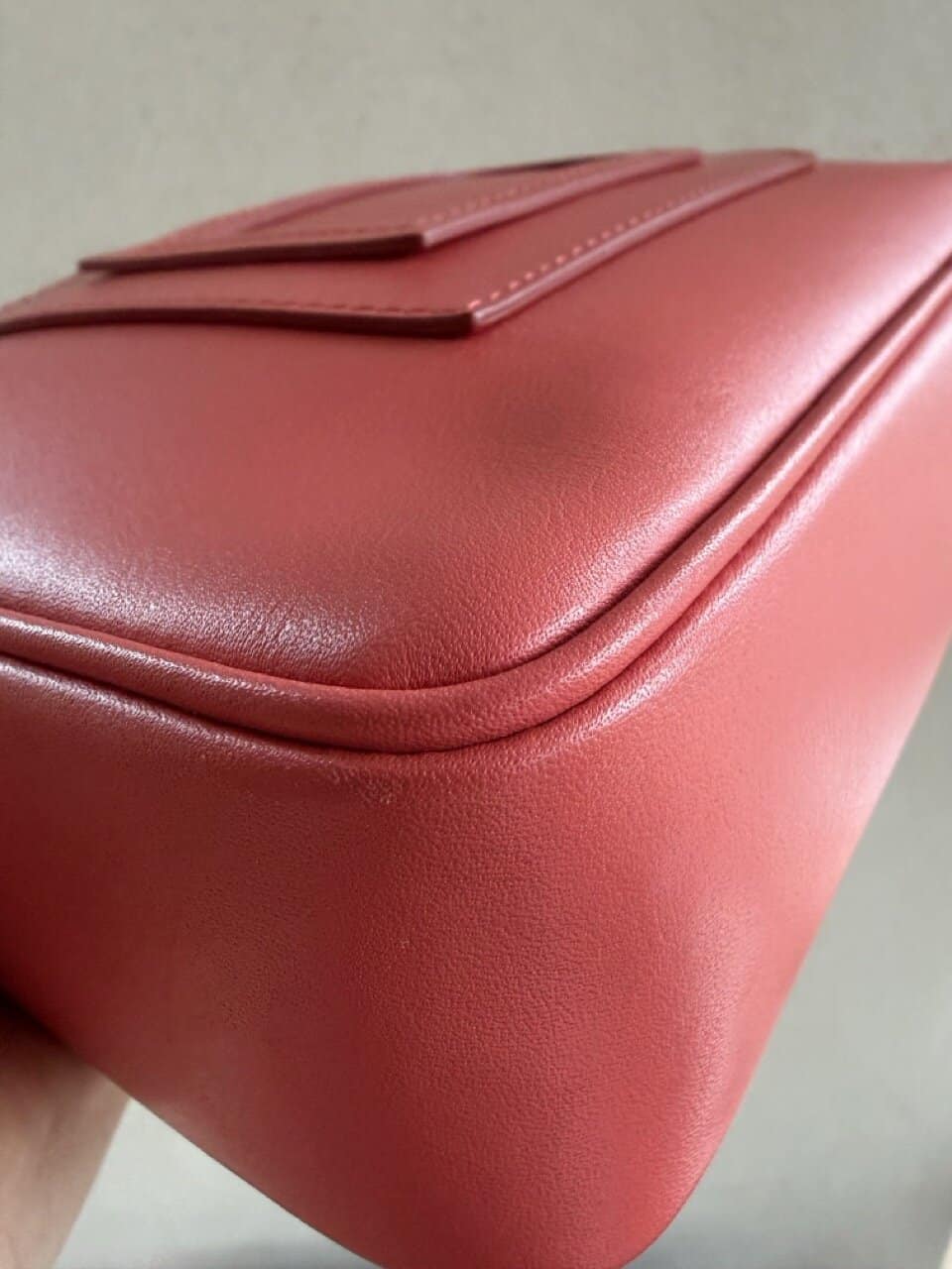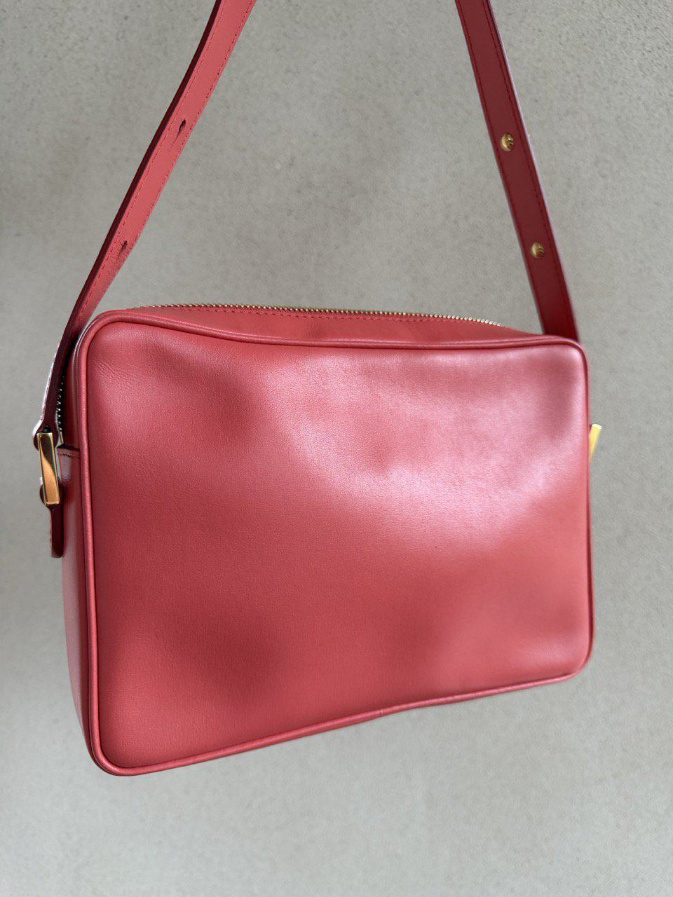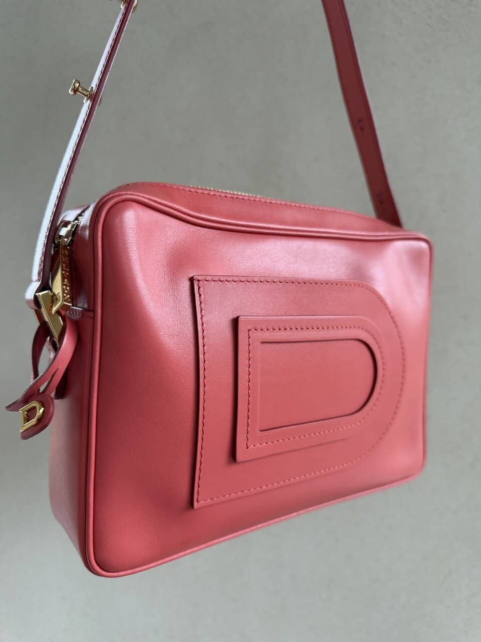 Ze komt in een zachte koraalkleur en gouden hardware en verkeert in complete nieuwstaat.