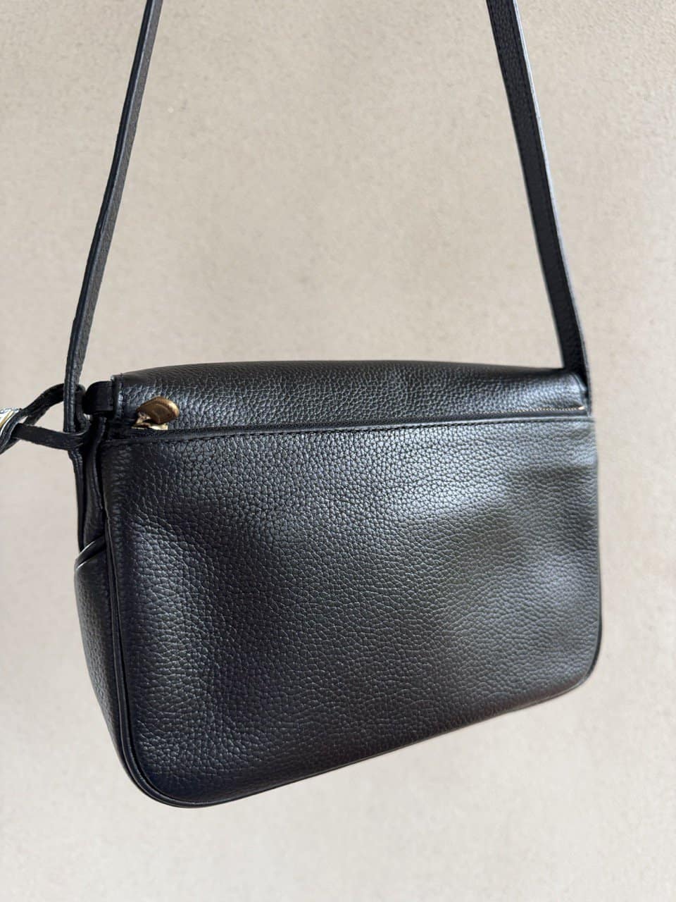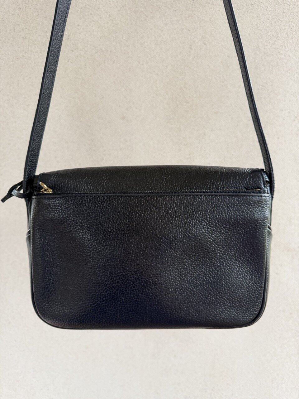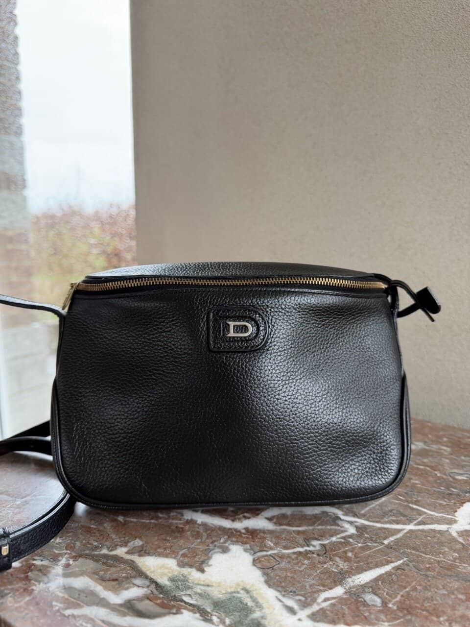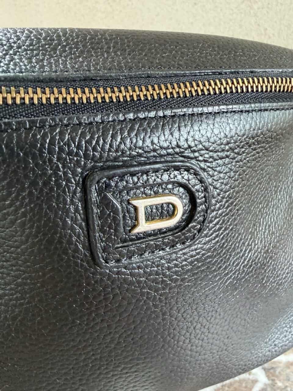 Dit is een crossbody met dunne lange riem, te verstellen met studs op 2 standen. De tas zelf is compact, maar groot genoeg voor een grote portefeuille, je gsm en zonnebril.