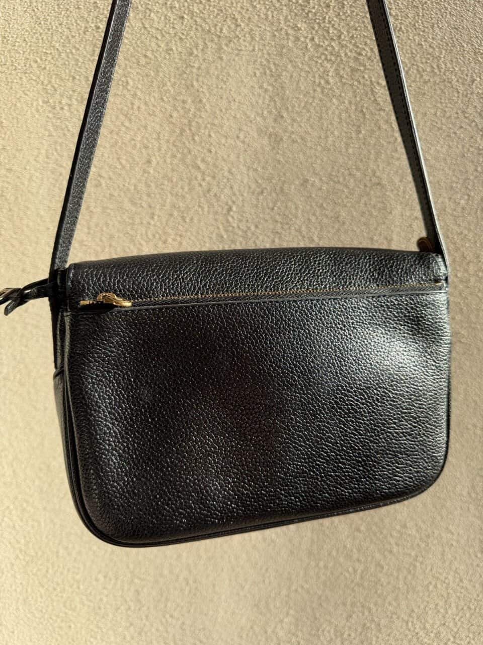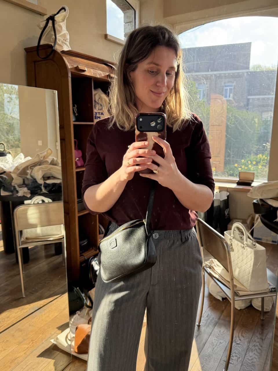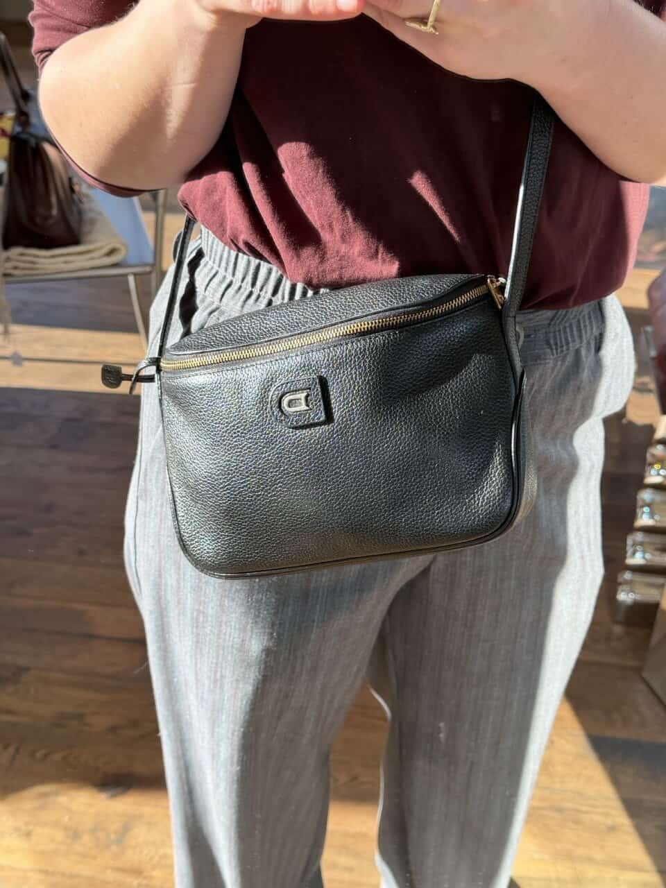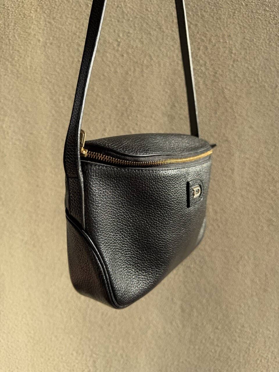 Dit is een crossbody met dunne lange riem, te verstellen met studs op 2 standen. De tas zelf is compact, maar groot genoeg voor een grote portefeuille, je gsm en zonnebril.
