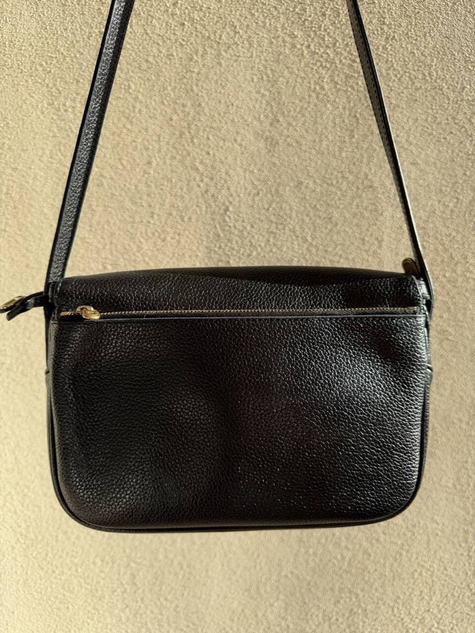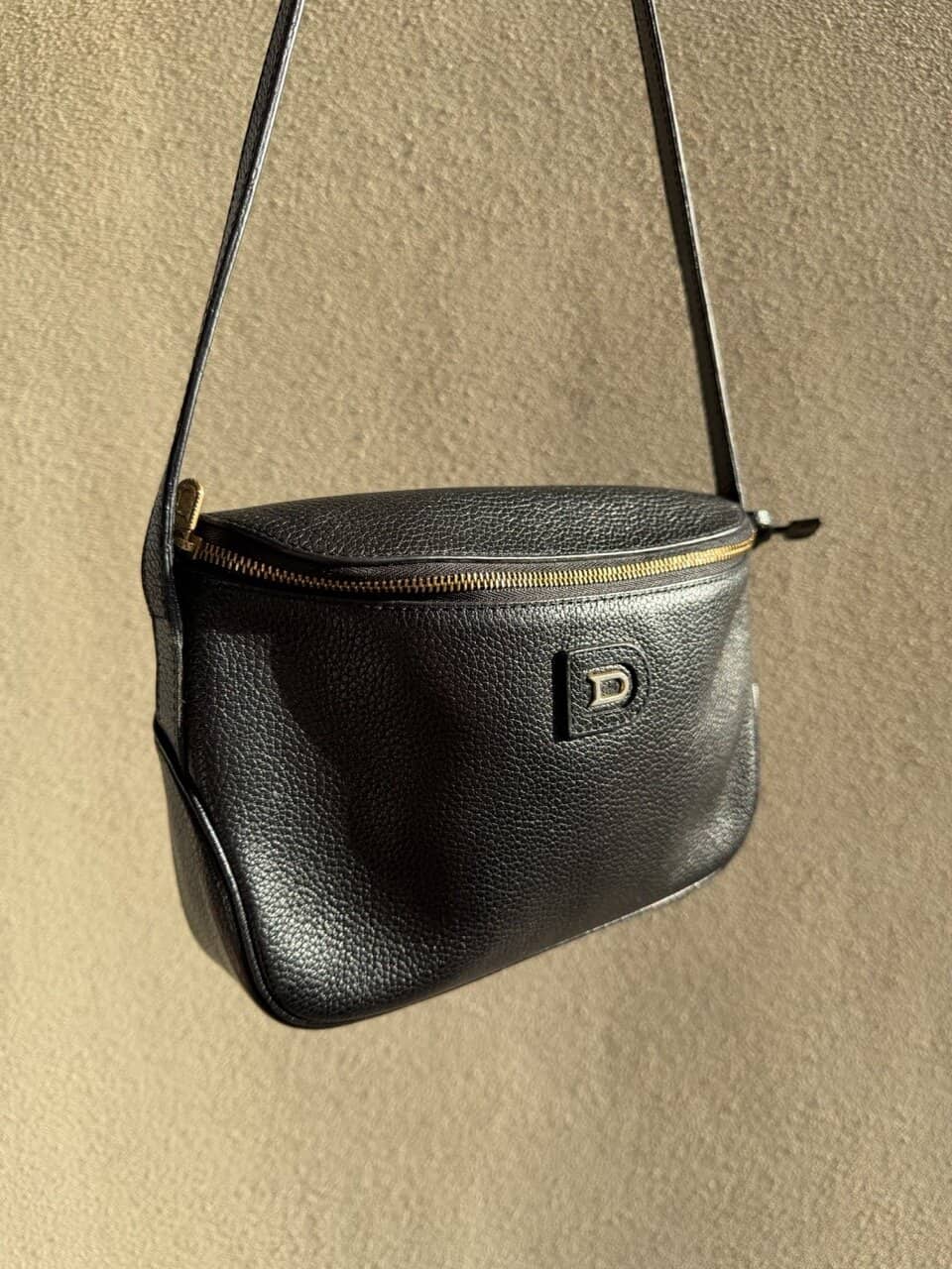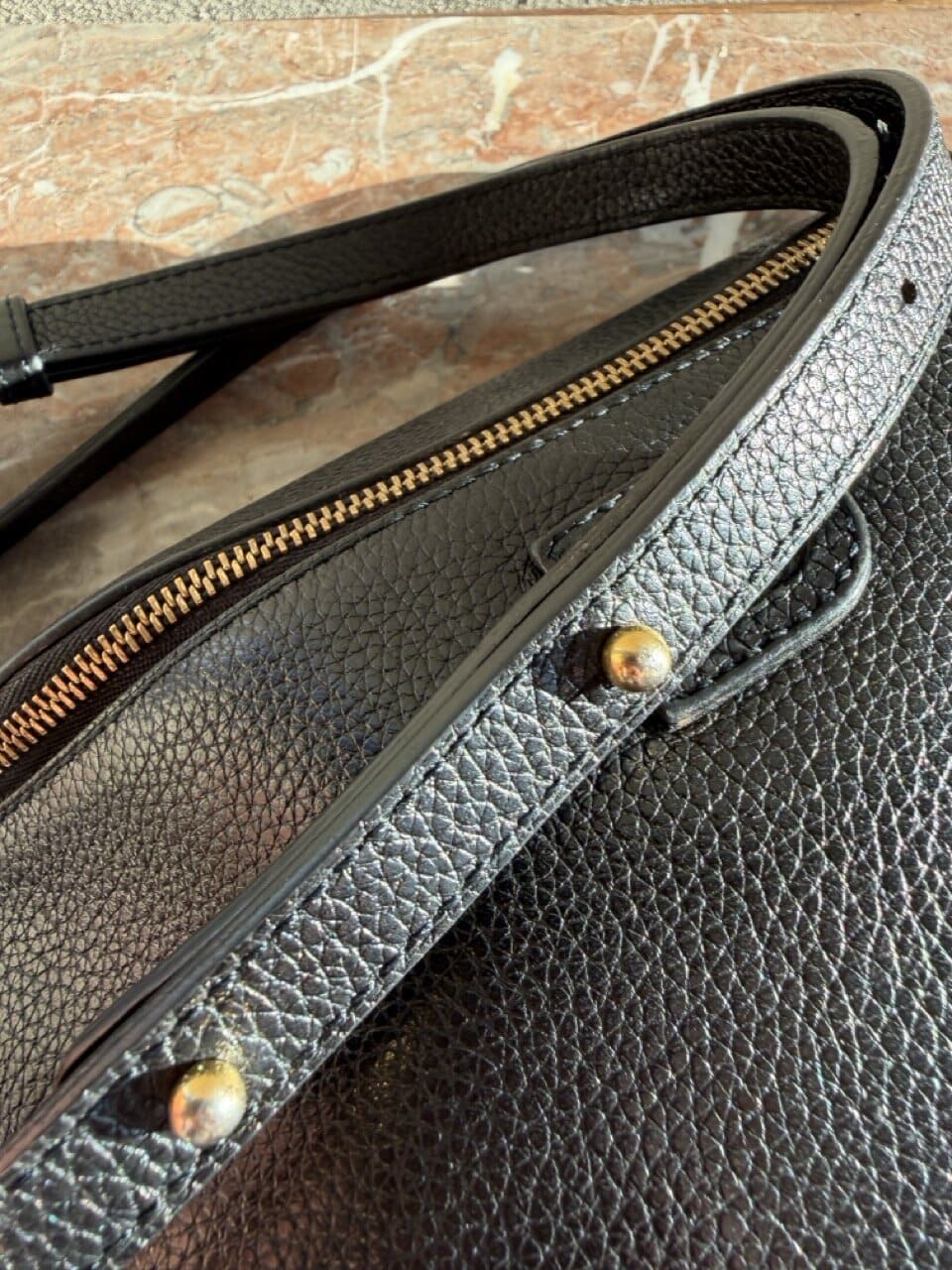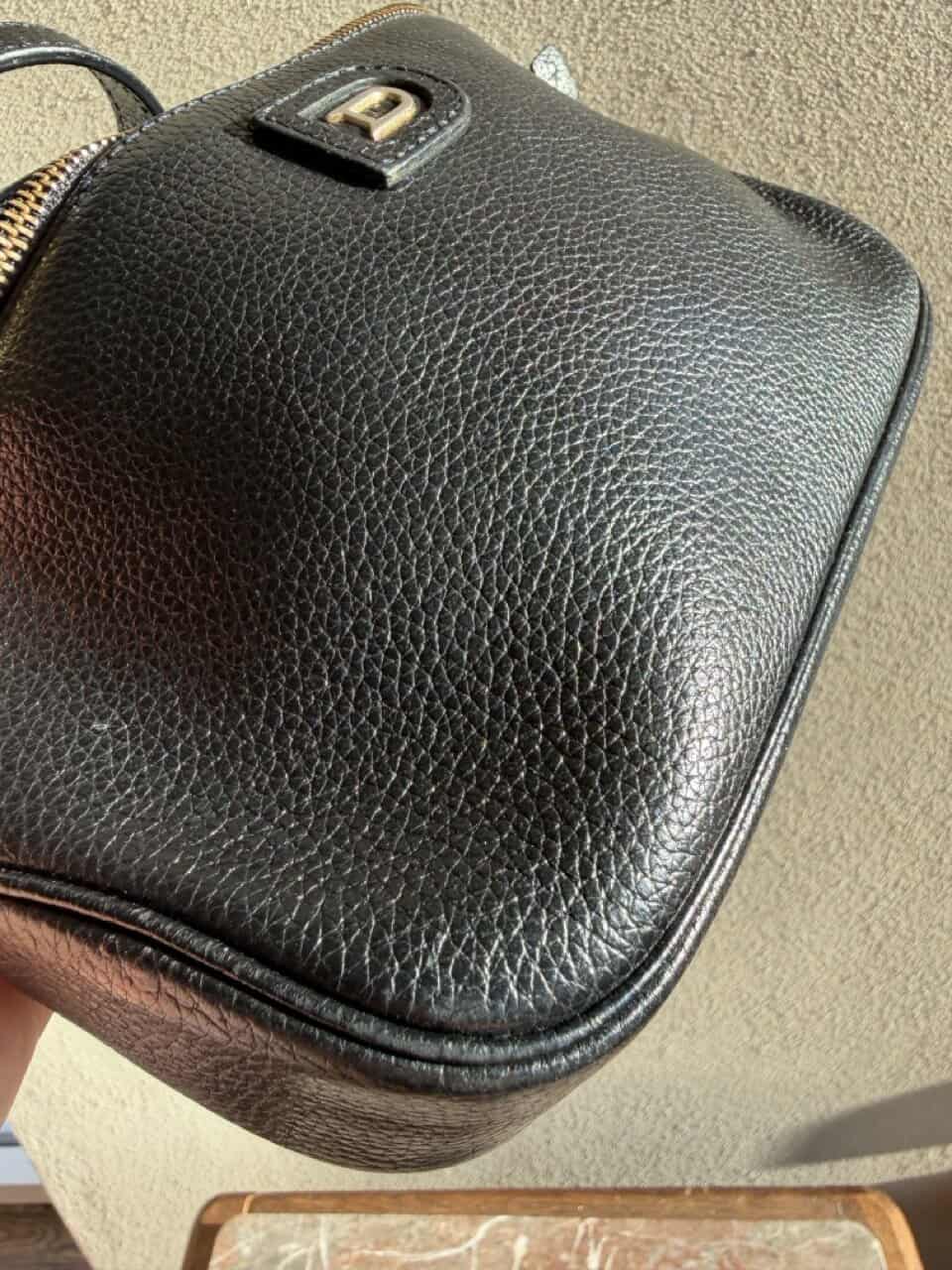 Dit is een crossbody met dunne lange riem, te verstellen met studs op 2 standen. De tas zelf is compact, maar groot genoeg voor een grote portefeuille, je gsm en zonnebril.