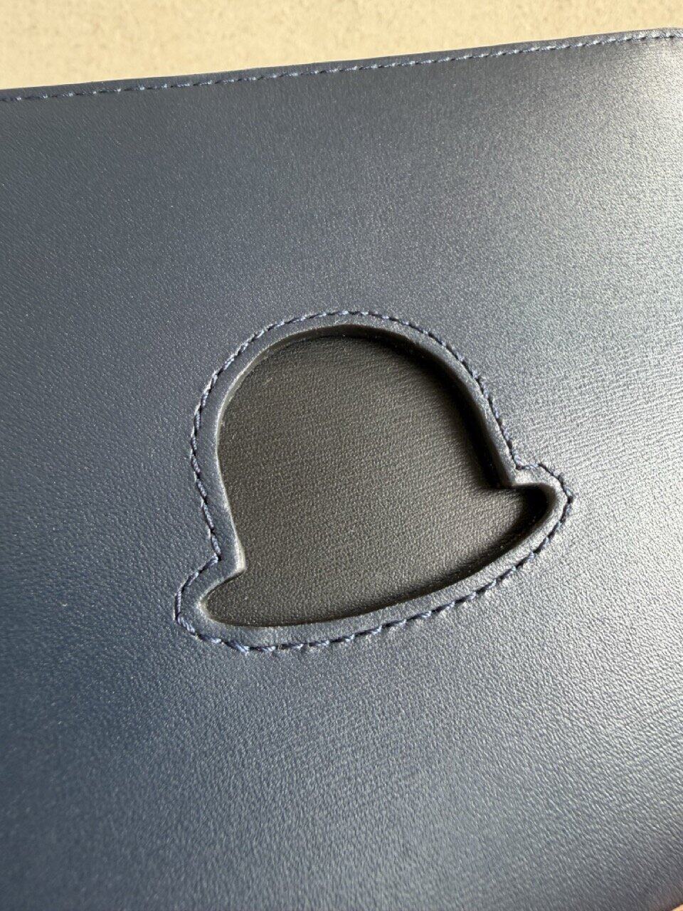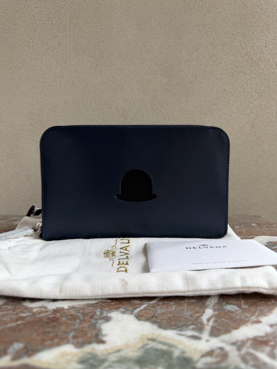Een portefeuille van de Magritte Collectie. Een grote portefeuille met bijhorende pochette voor munten. De pochette heeft een plekje achter de hoedvormige perforatie om zo een illusie-effect te creëren.