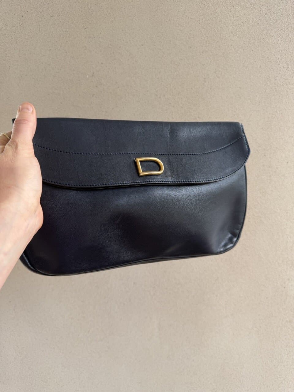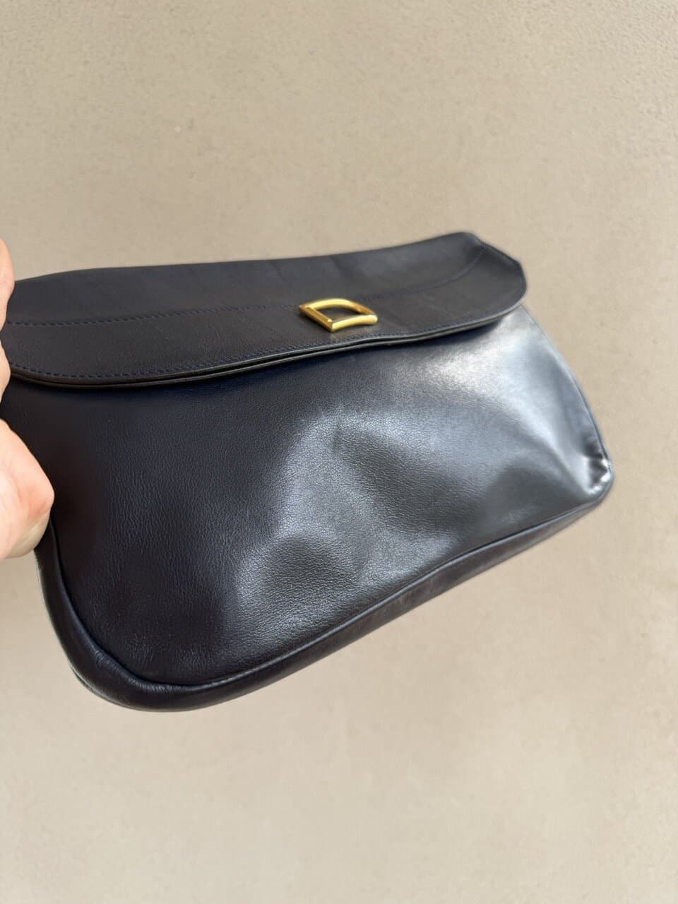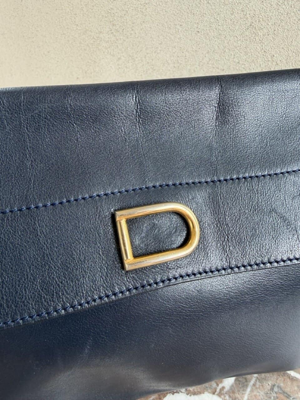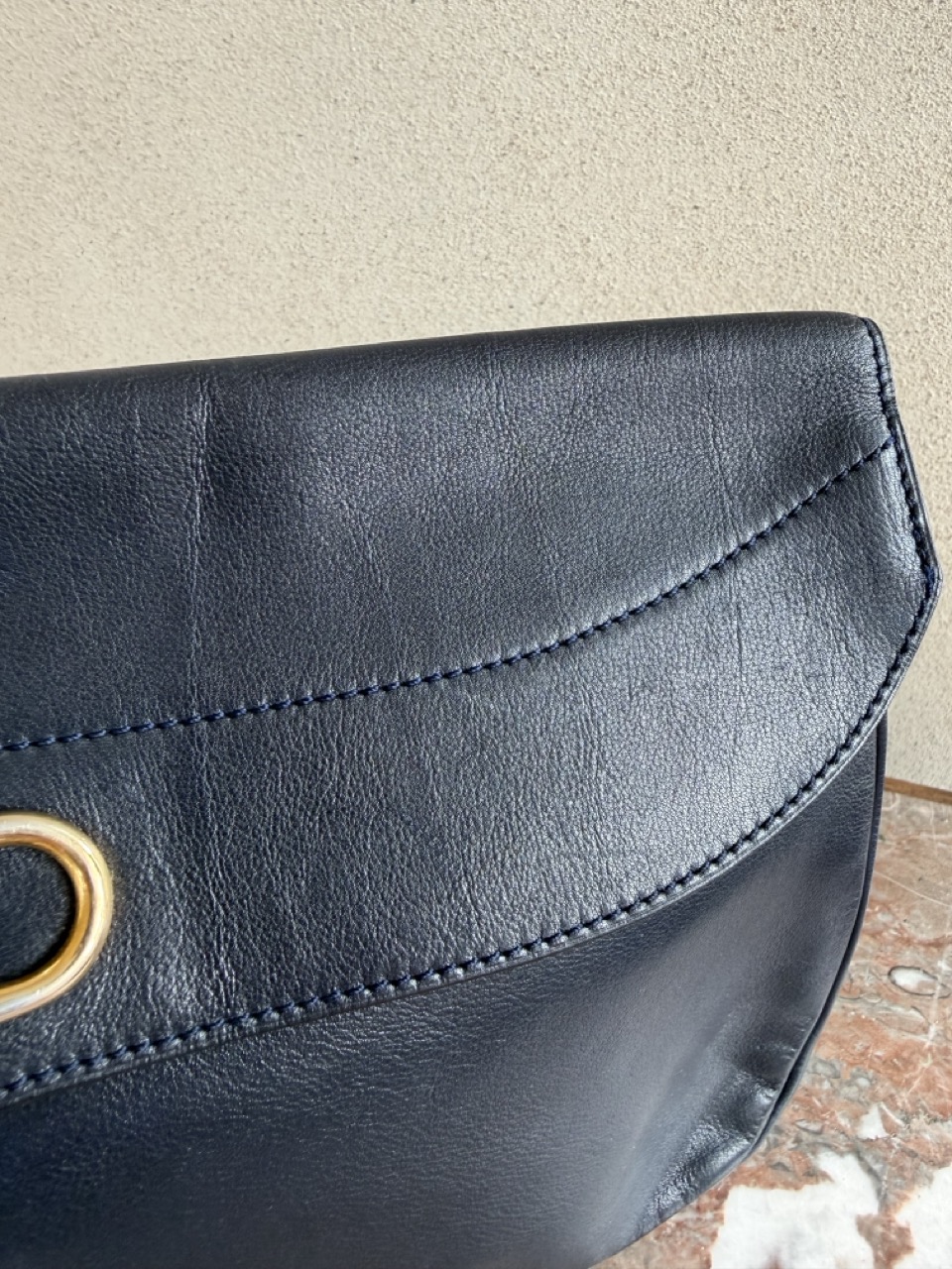 Deze Clutch komt in marineblauw zijdezacht kalfsleder en is uit de jaren 70.