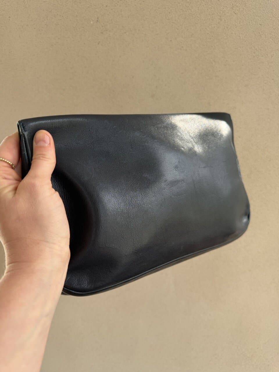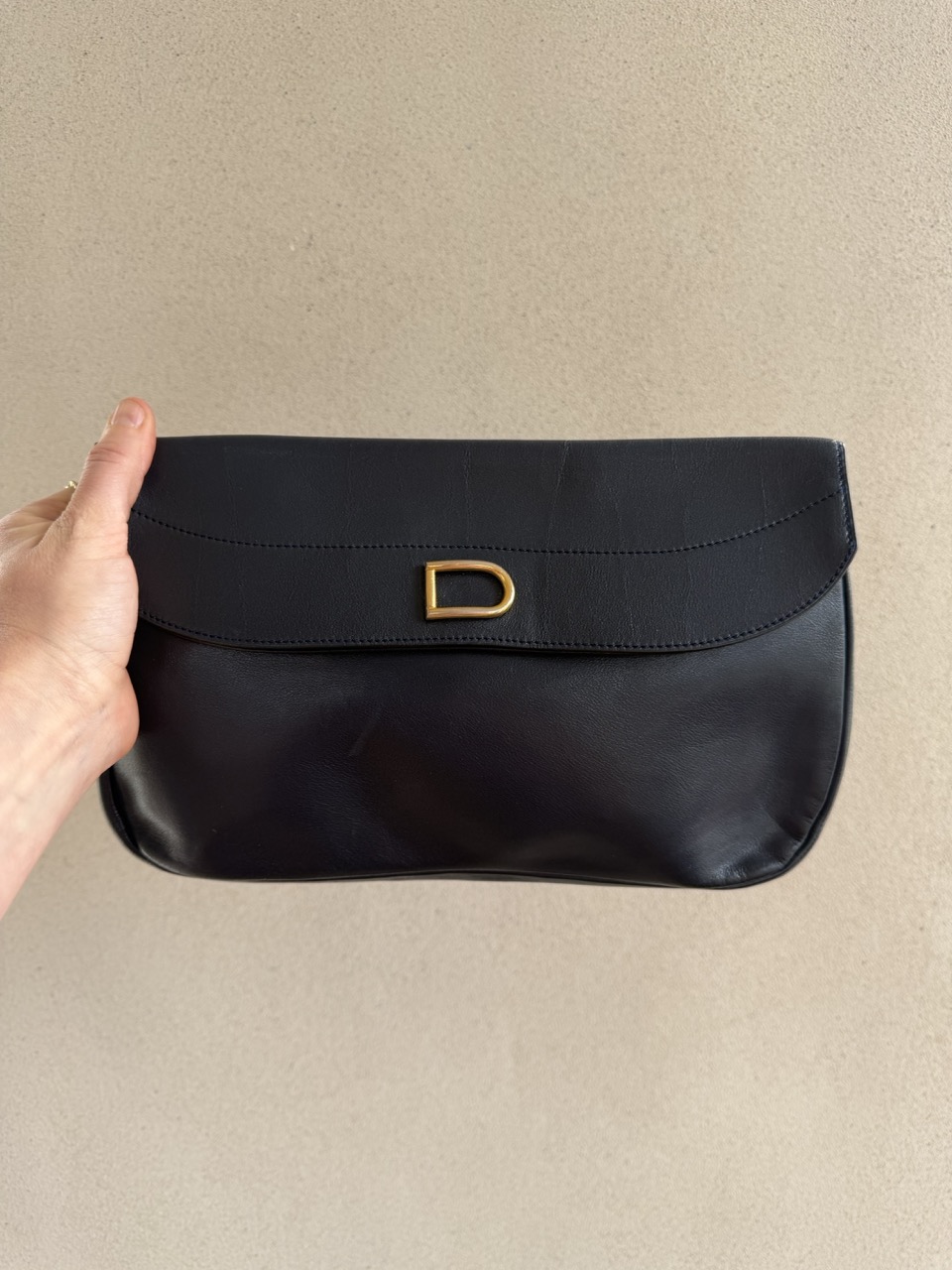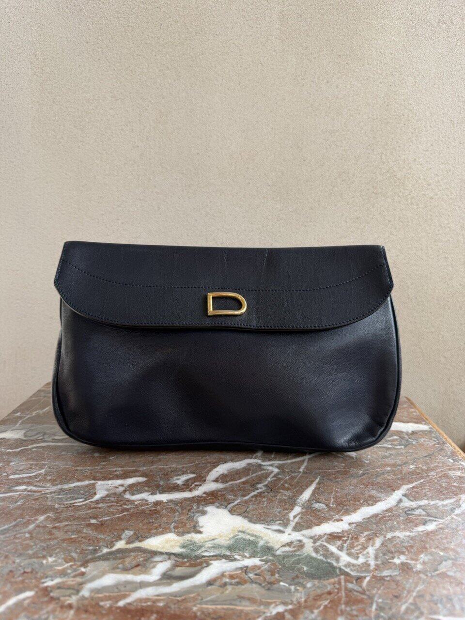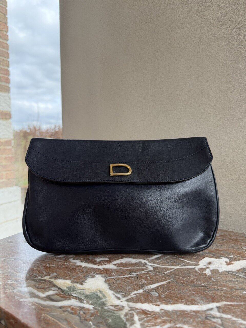 Deze Clutch komt in marineblauw zijdezacht kalfsleder en is uit de jaren 70.