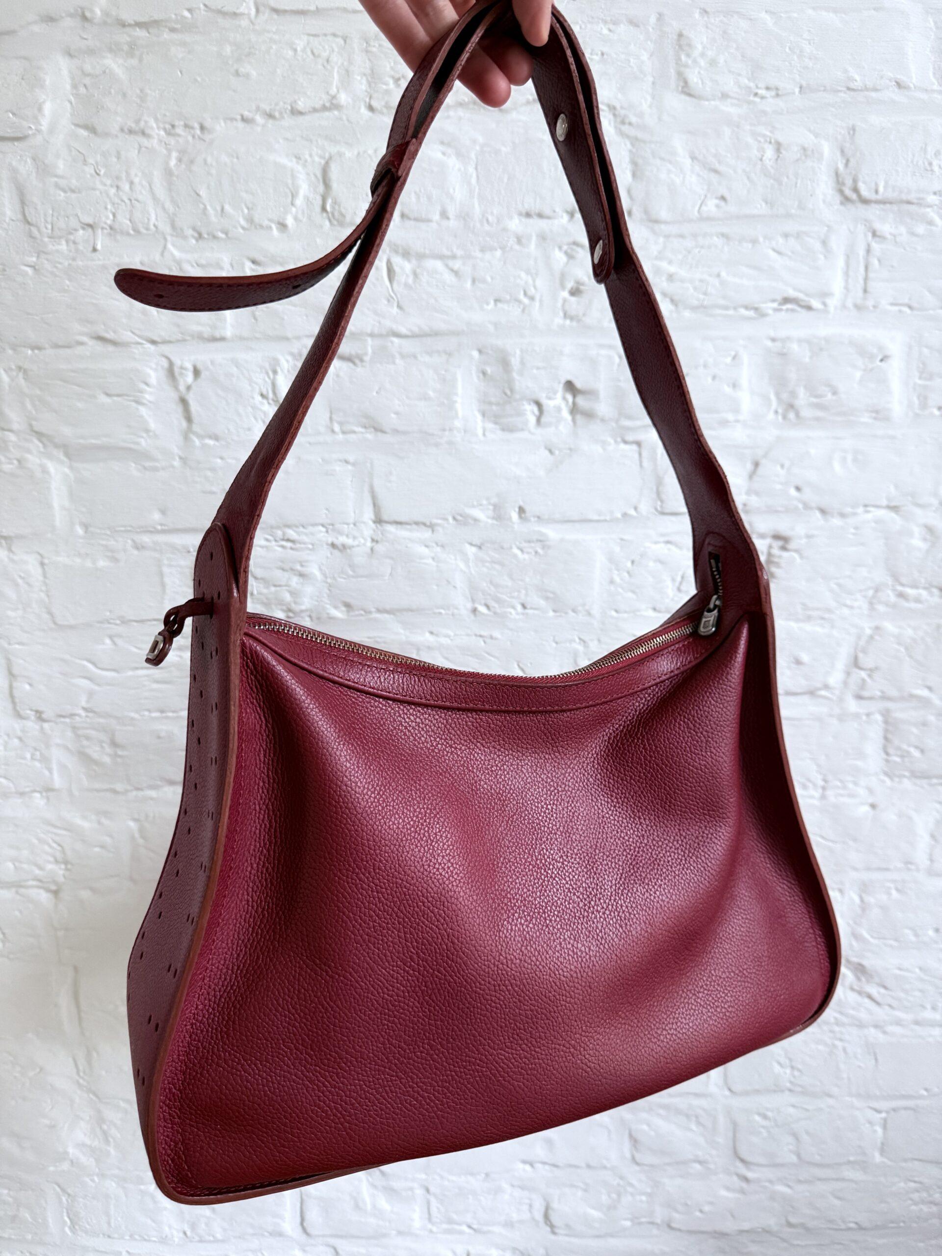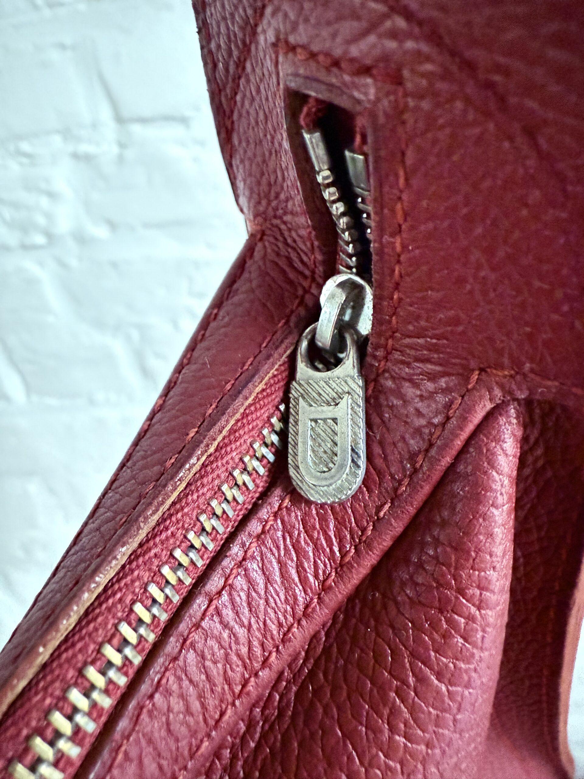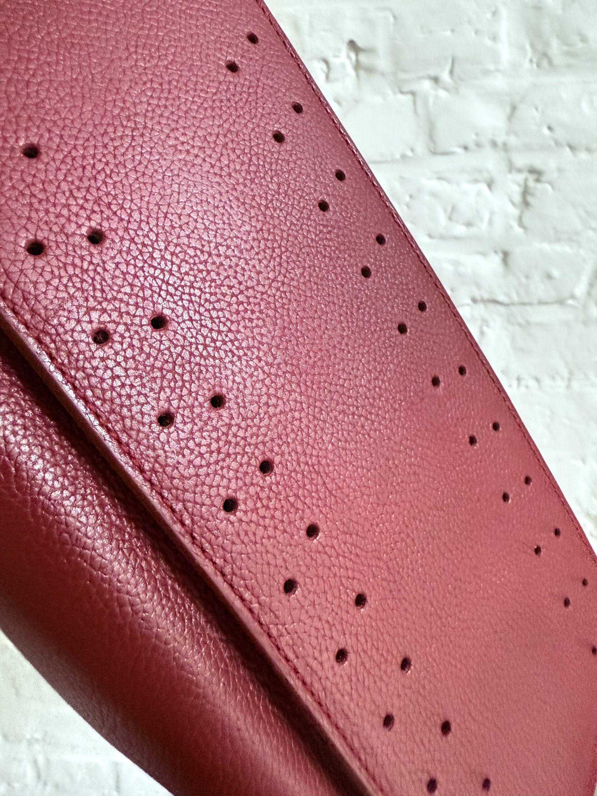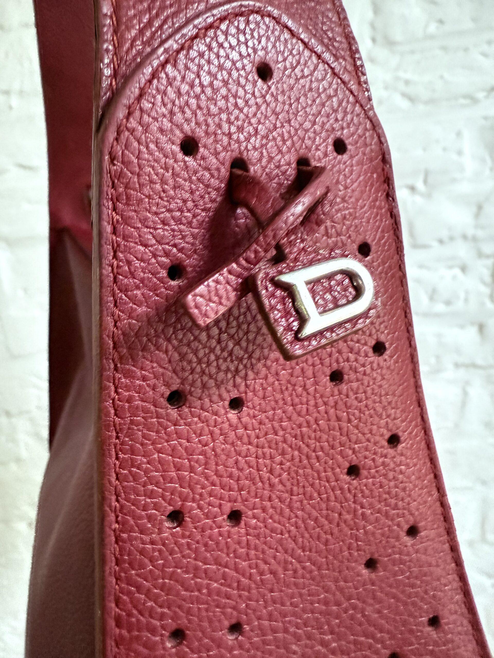 Deze prachtige Delvaux tas is gemaakt van Rosso (tussen bordeaux en rode kleur) leder met goudkleurige ritssluiting en heeft geperforeerde zijkanten.