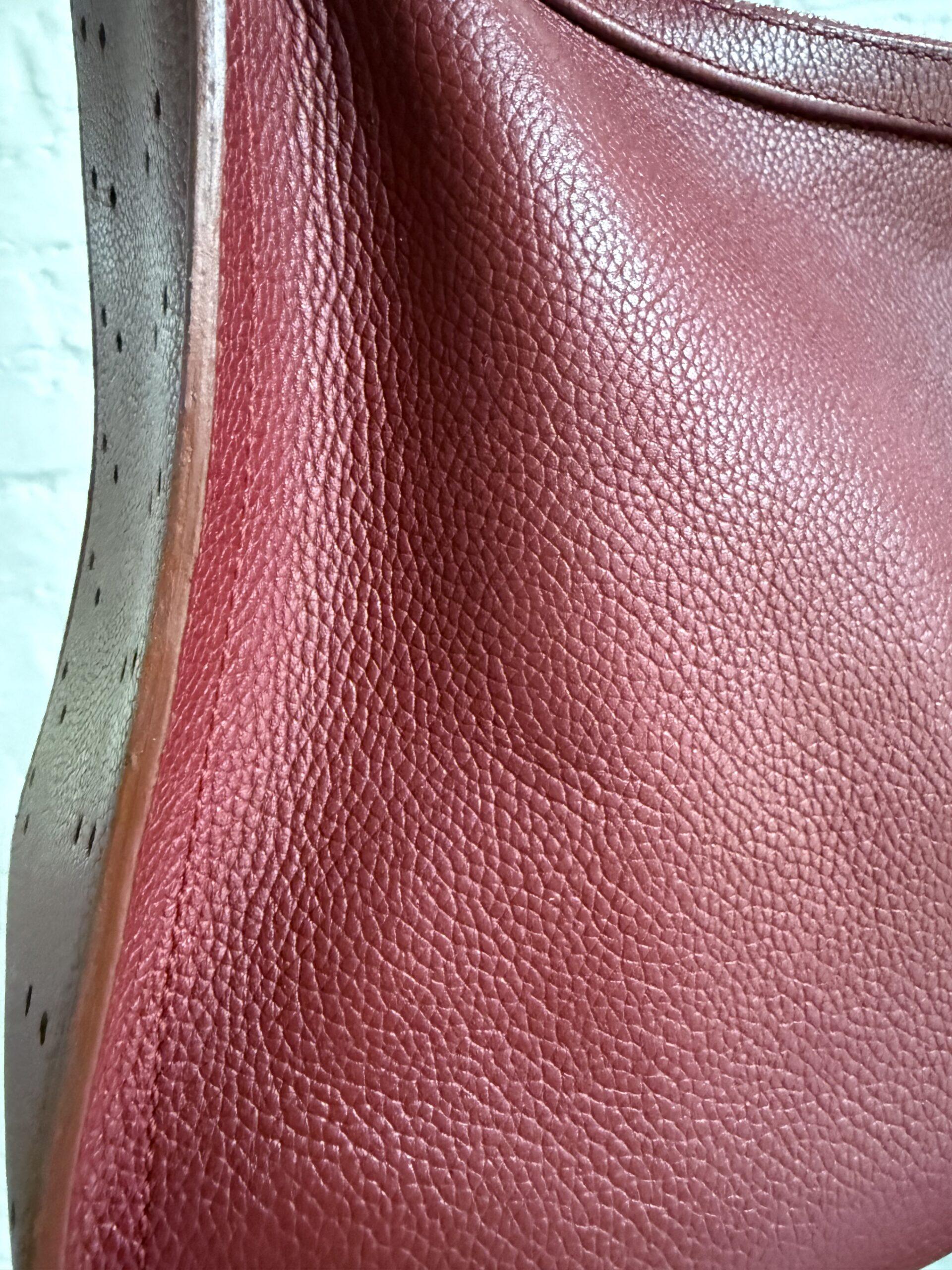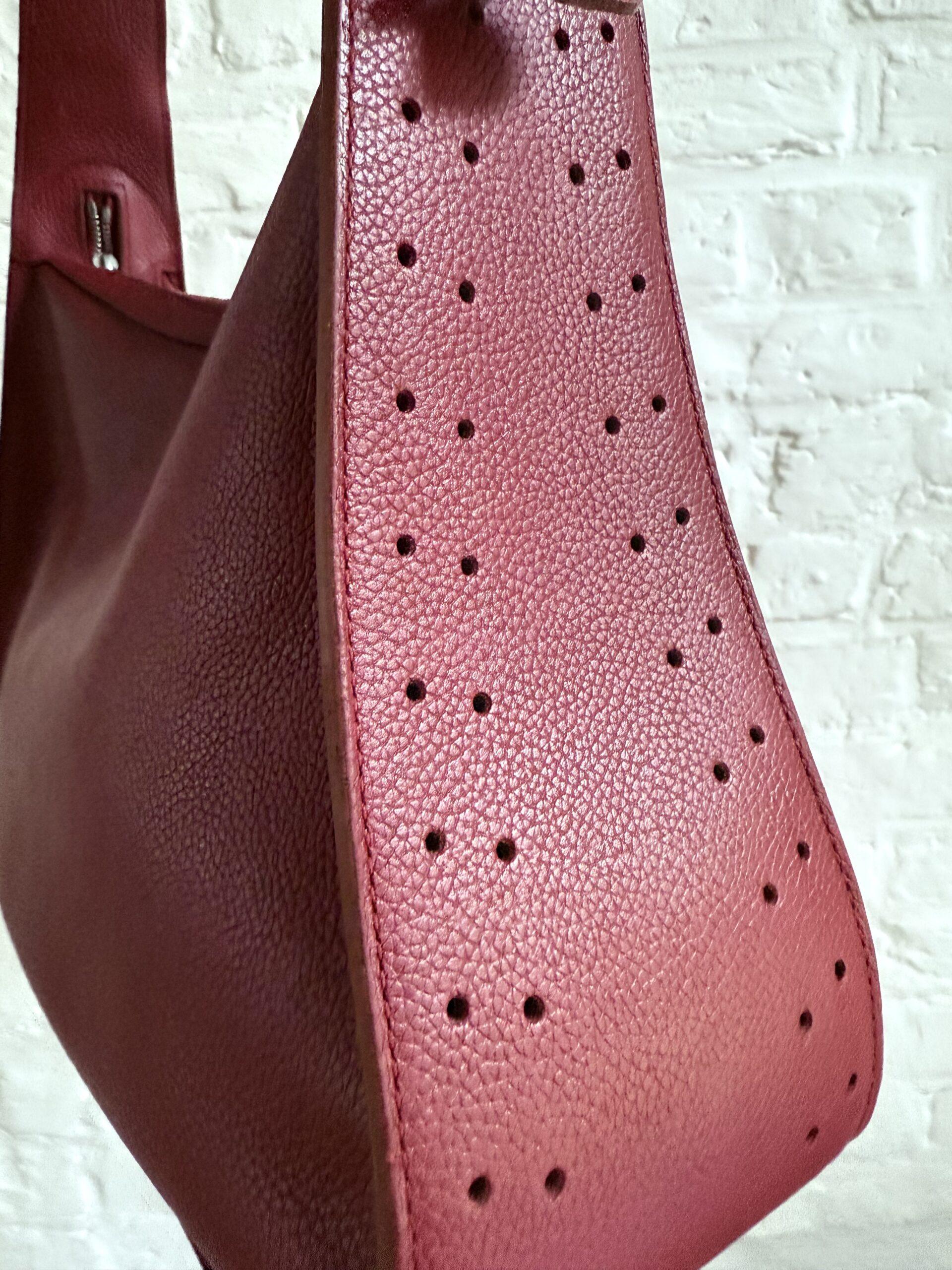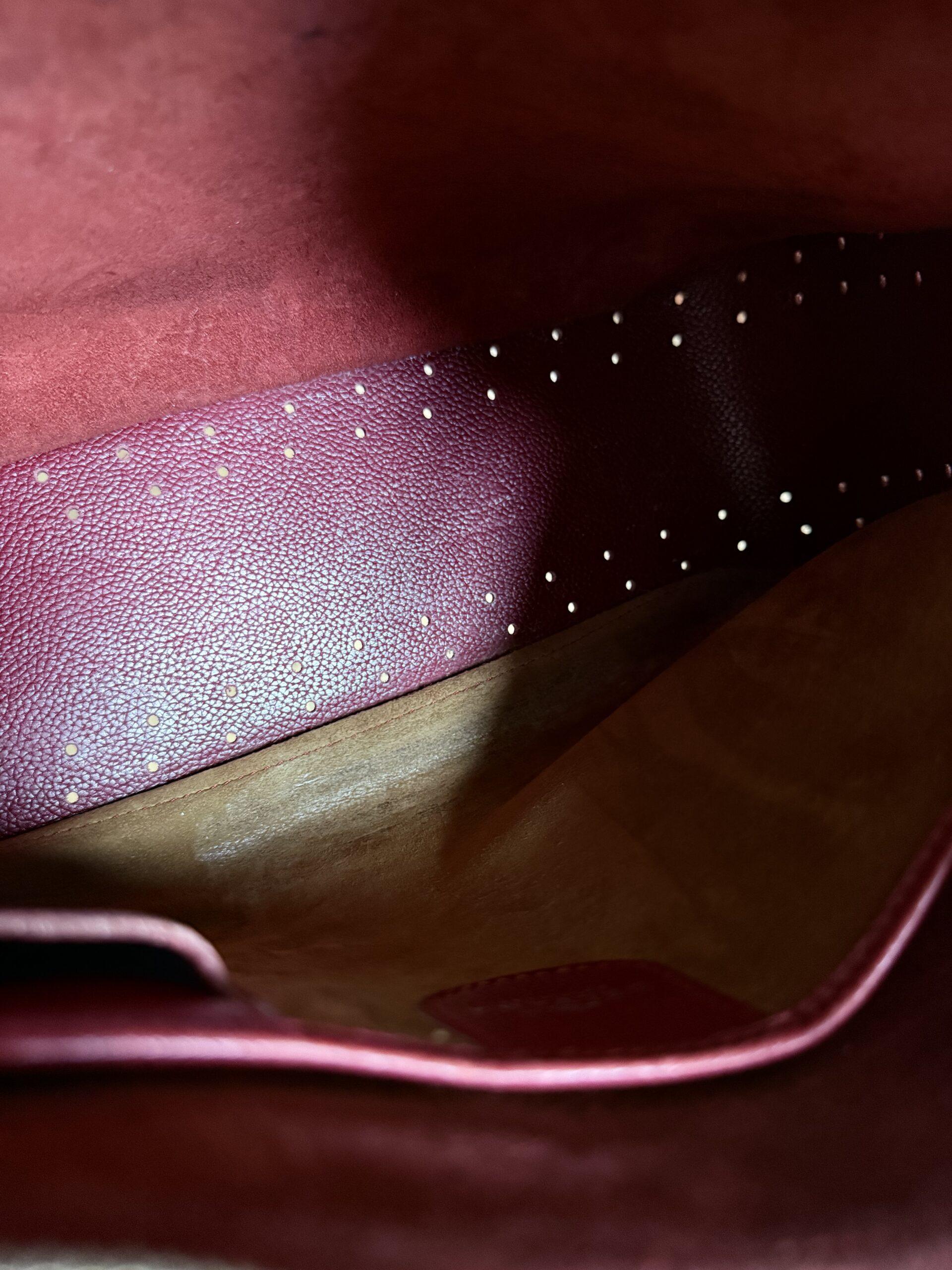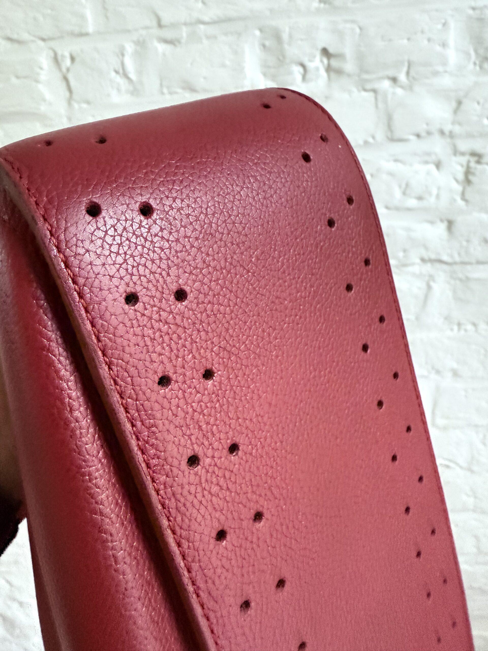 Deze prachtige Delvaux tas is gemaakt van Rosso (tussen bordeaux en rode kleur) leder met goudkleurige ritssluiting en heeft geperforeerde zijkanten.