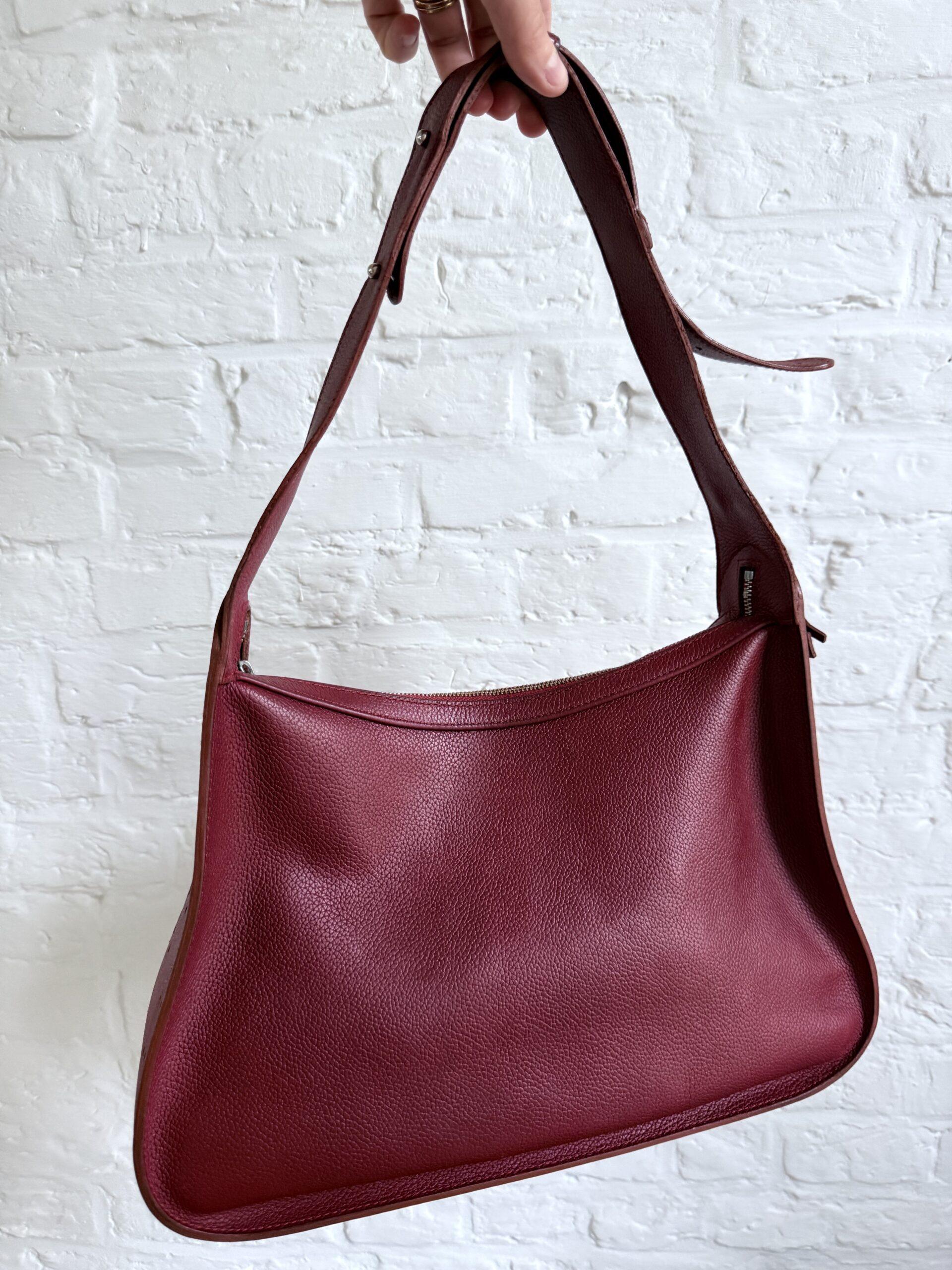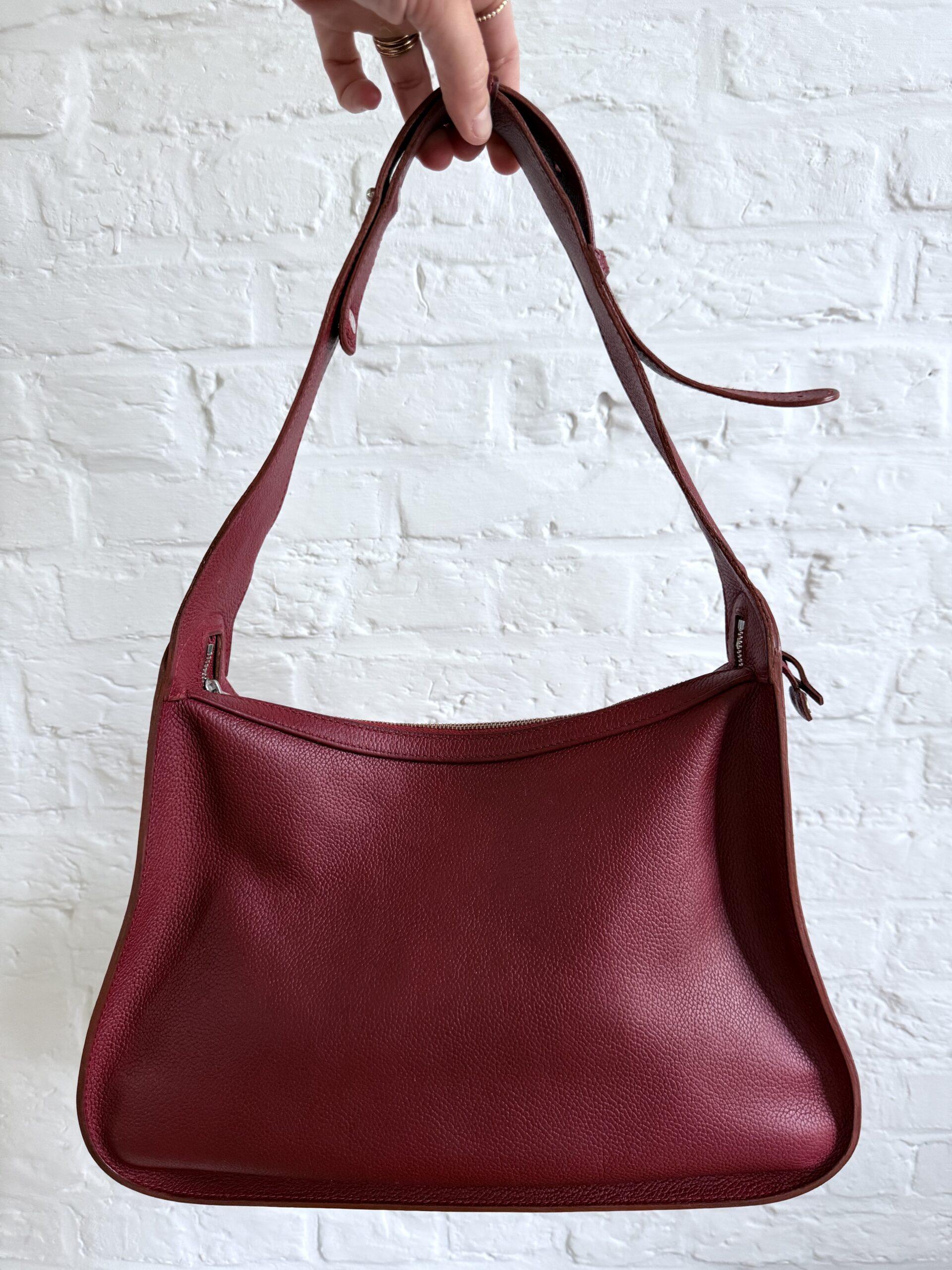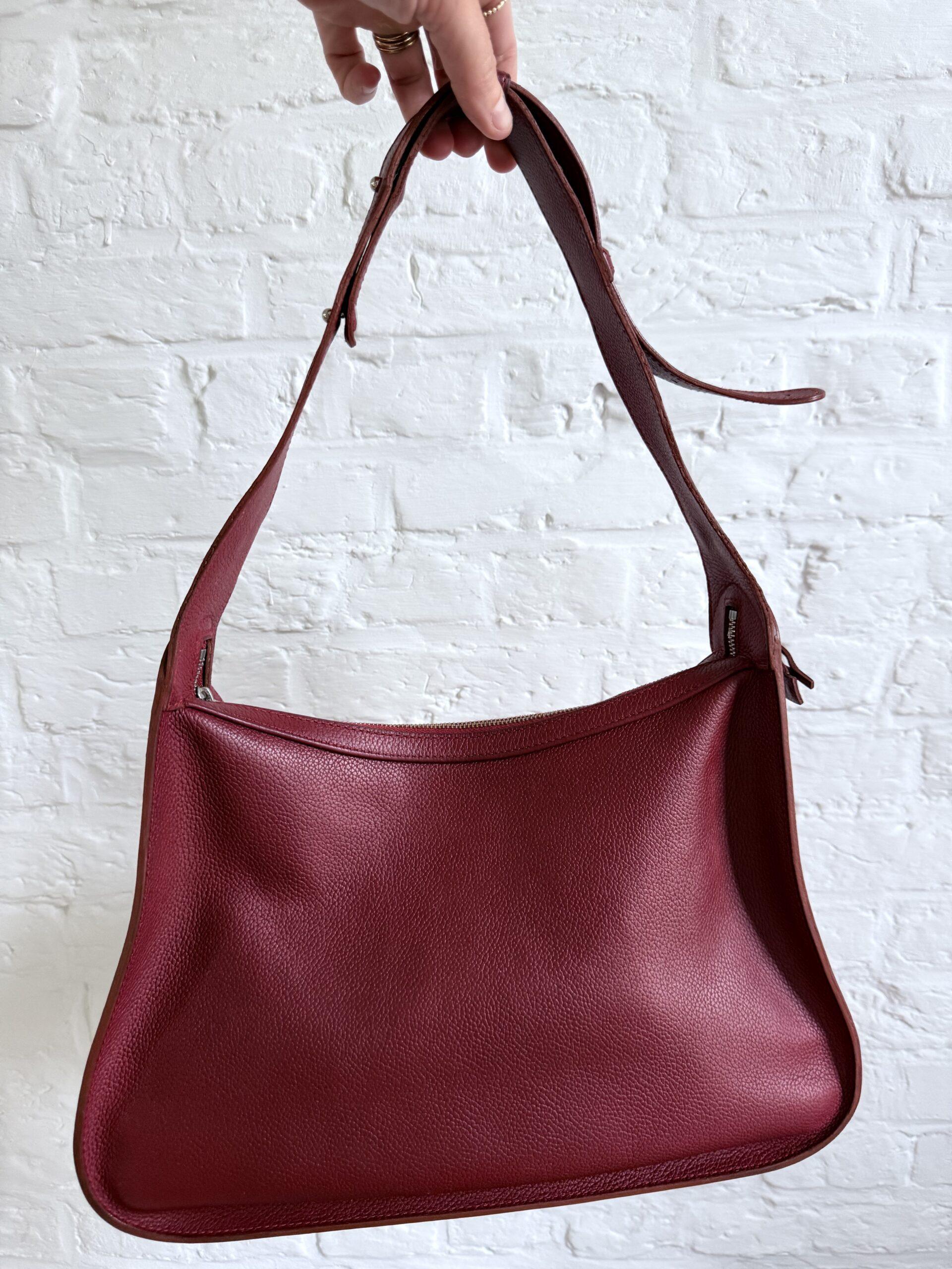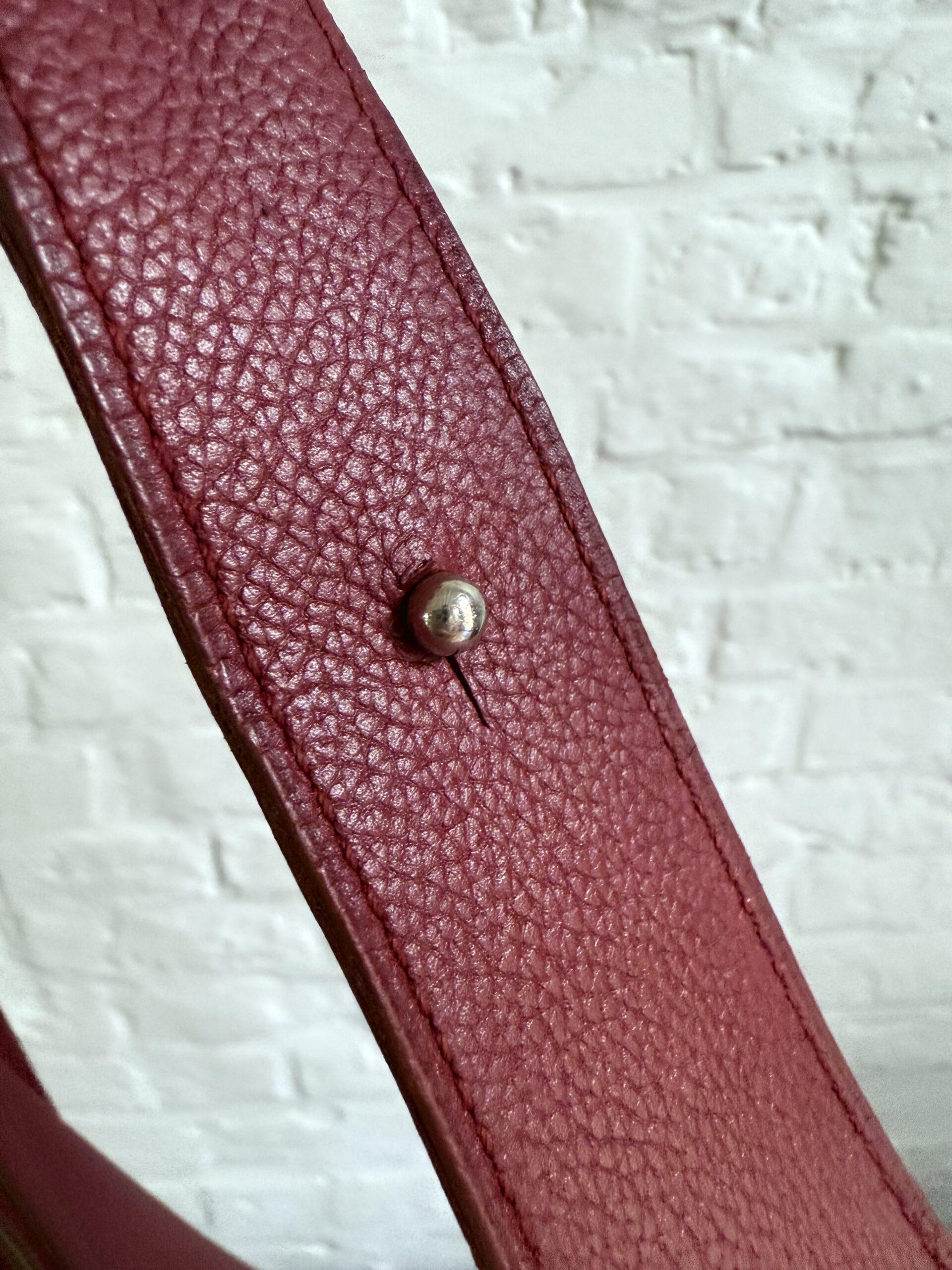 Deze prachtige Delvaux tas is gemaakt van Rosso (tussen bordeaux en rode kleur) leder met goudkleurige ritssluiting en heeft geperforeerde zijkanten.
