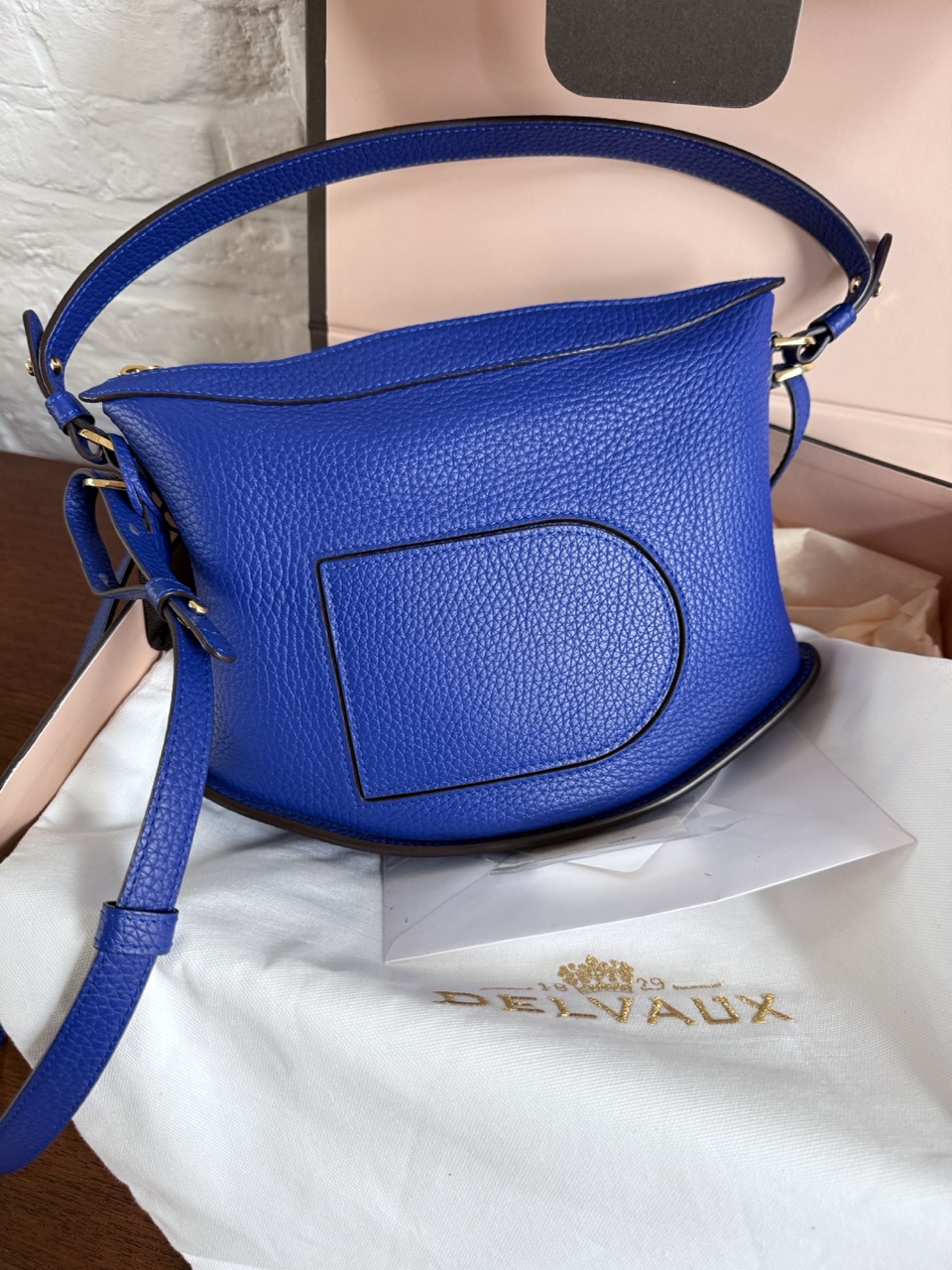 Authentieke Delvaux stofzak, Doos, Factuur, Riem