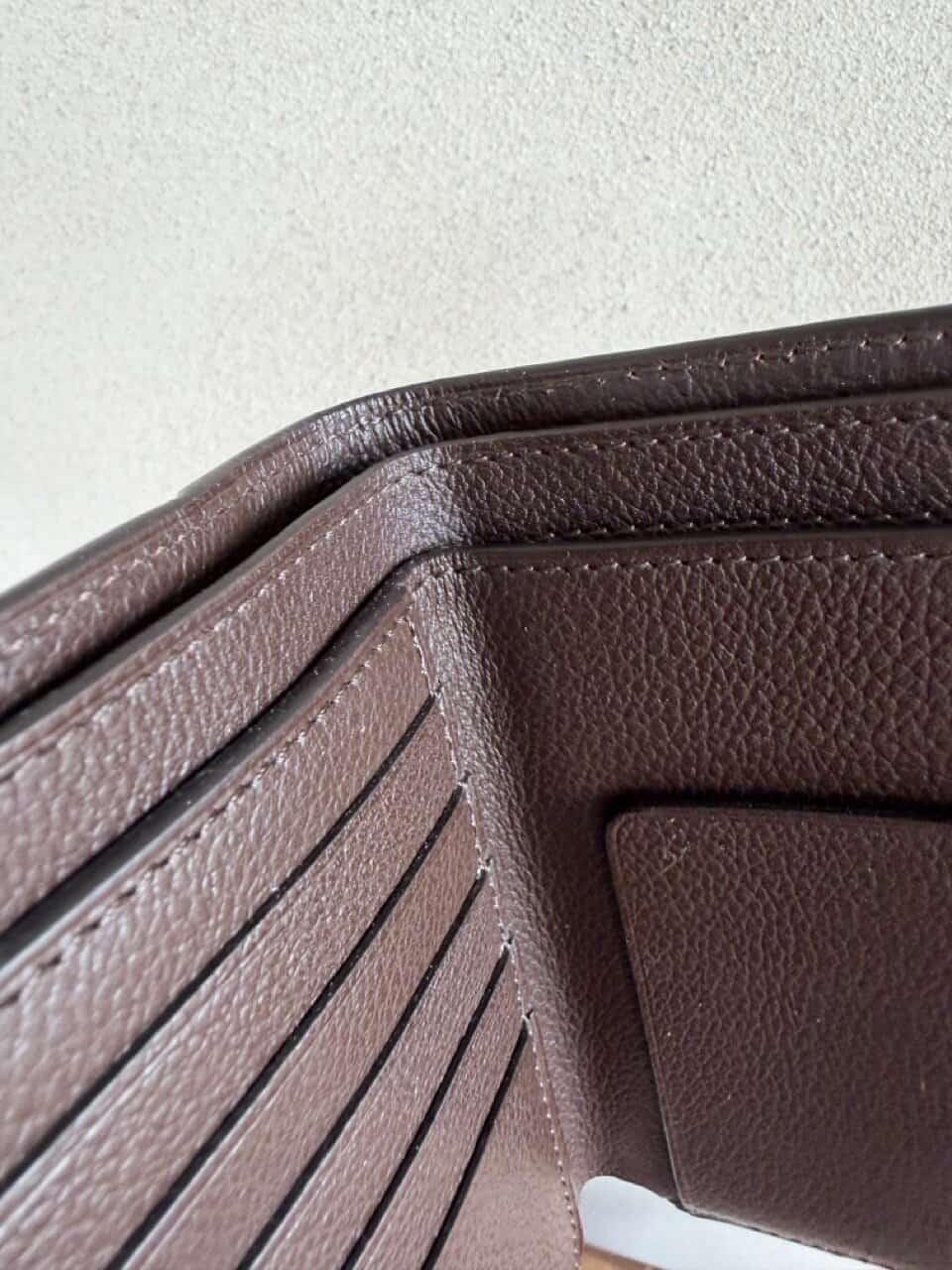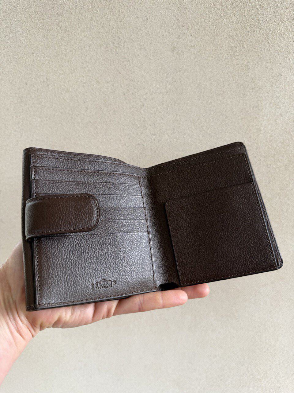 Een compacte portefeuille in Café jumping calf en gouden hardware.
