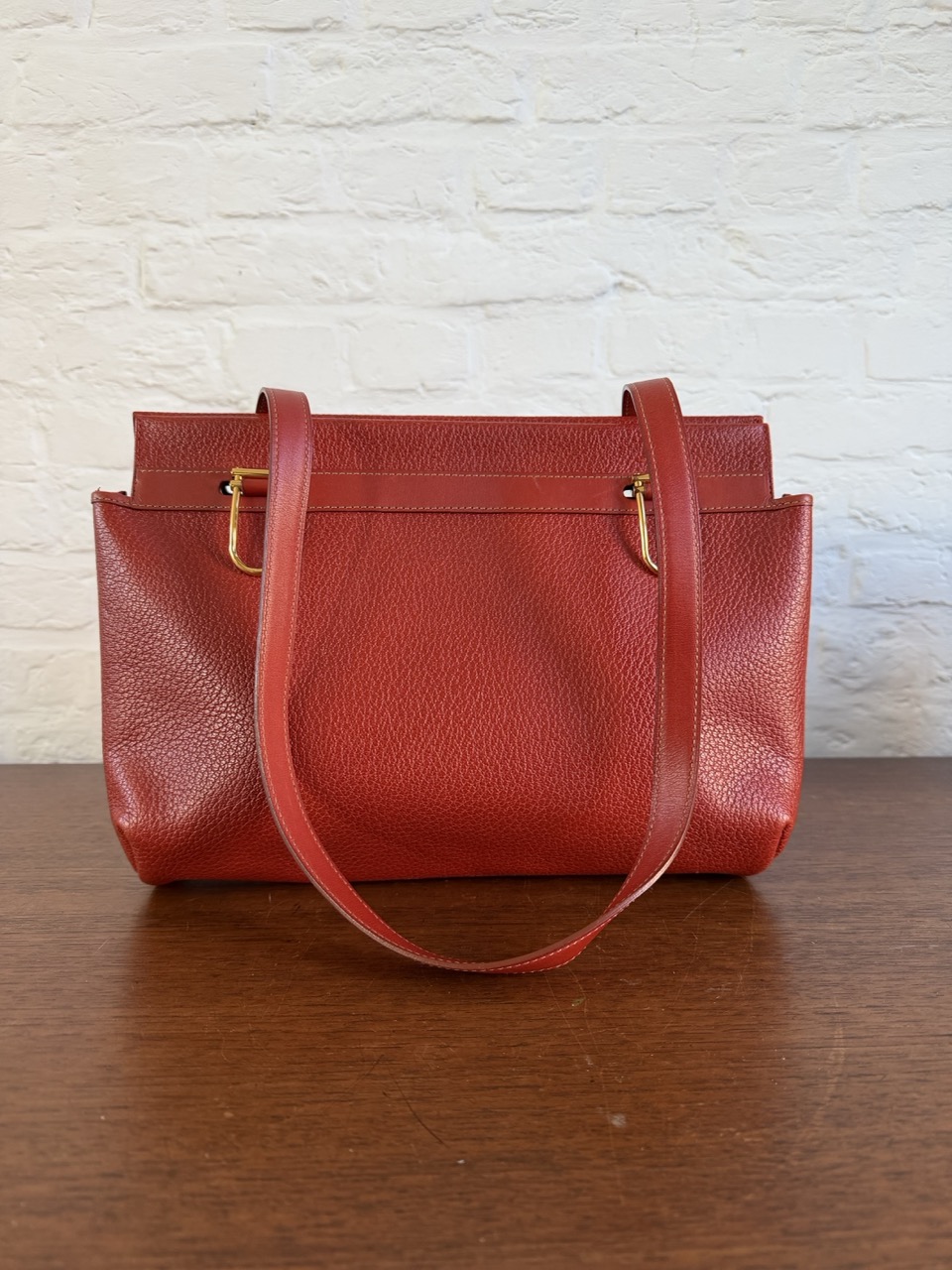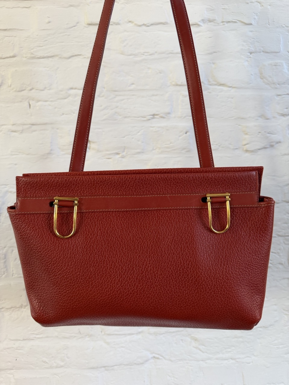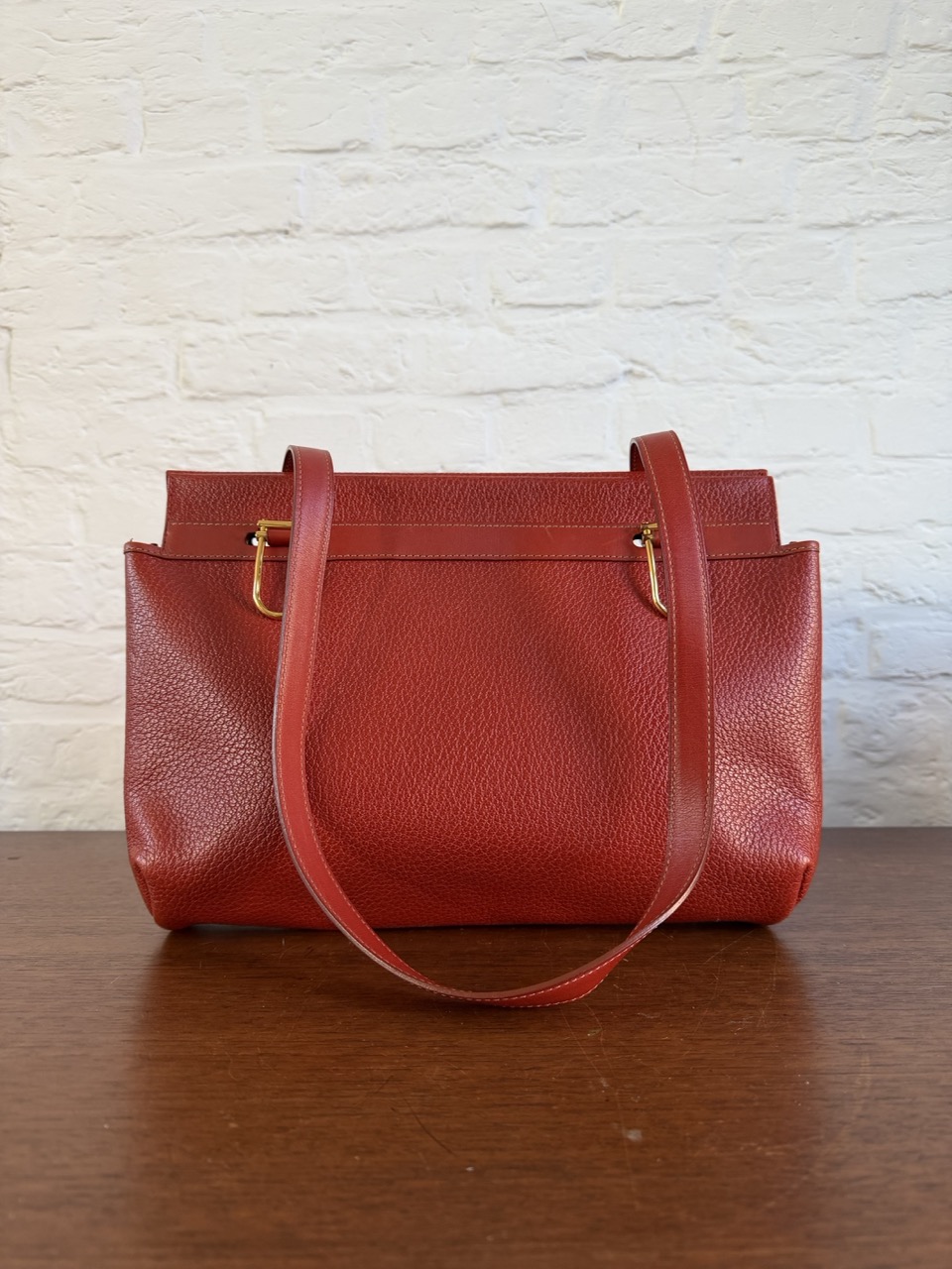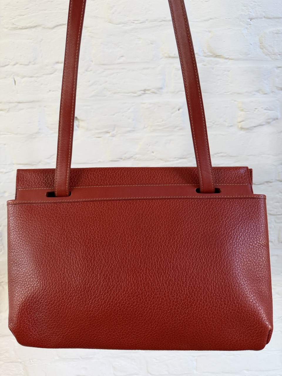 Deze ruime schoudertas komt in Birque jumping calf en is afgewerkt met details in een gladder kalfsleder.