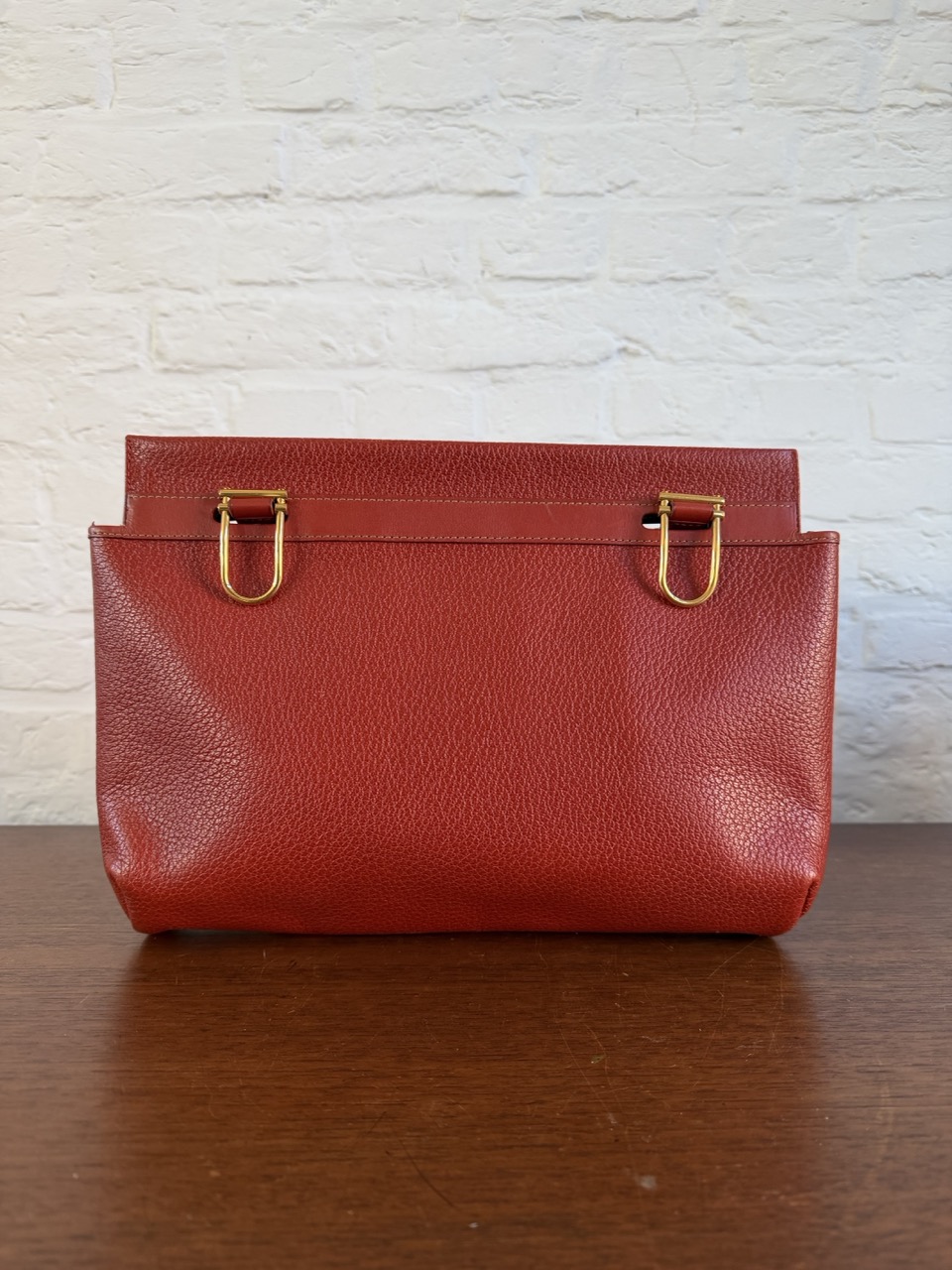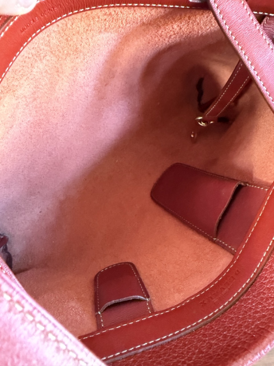 Het is een luxueuze tas met gouden hardware die niet gevoerd is. De vleeskant van het leder is ook de afwerking aan de binnenzijde.