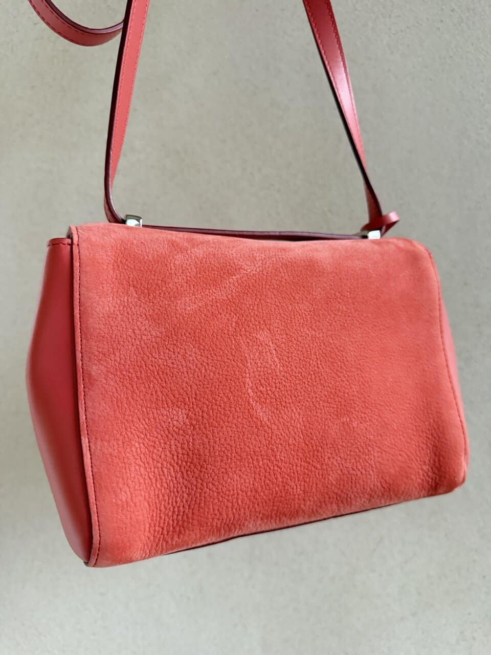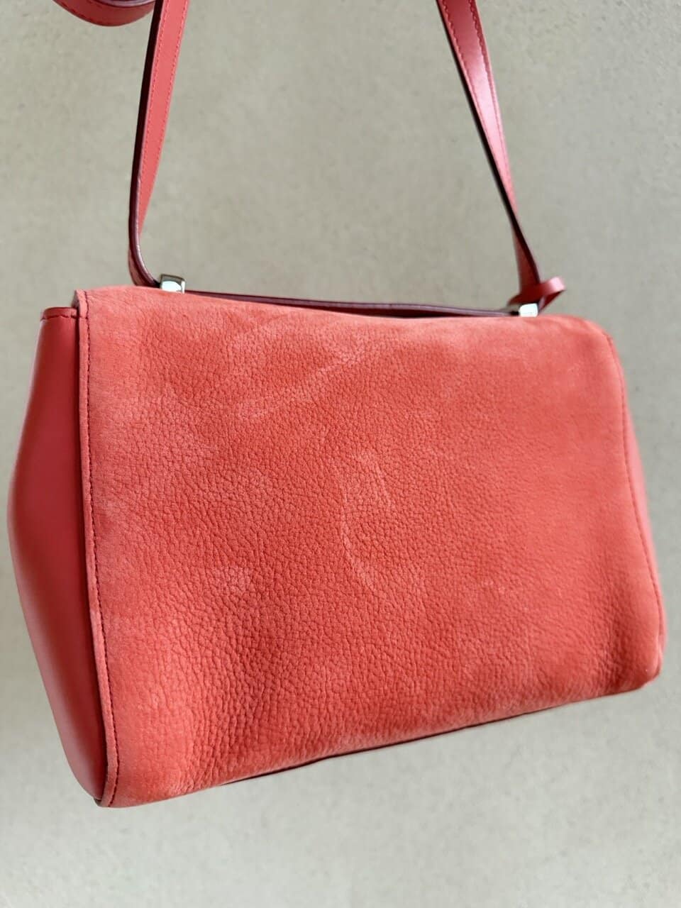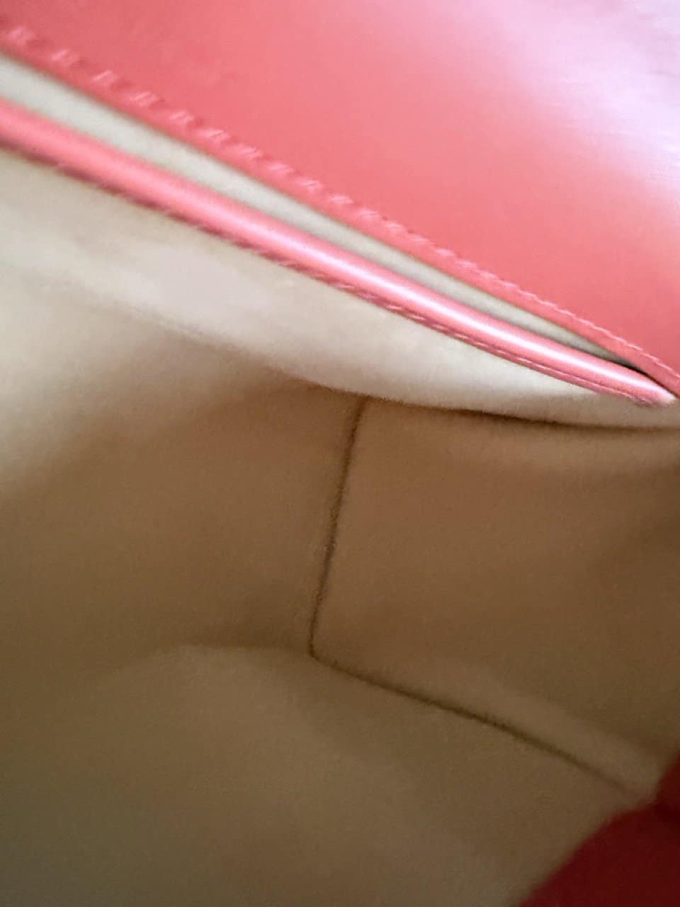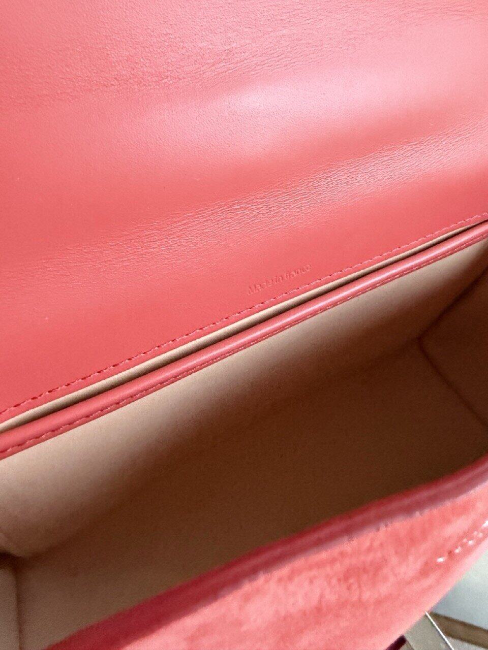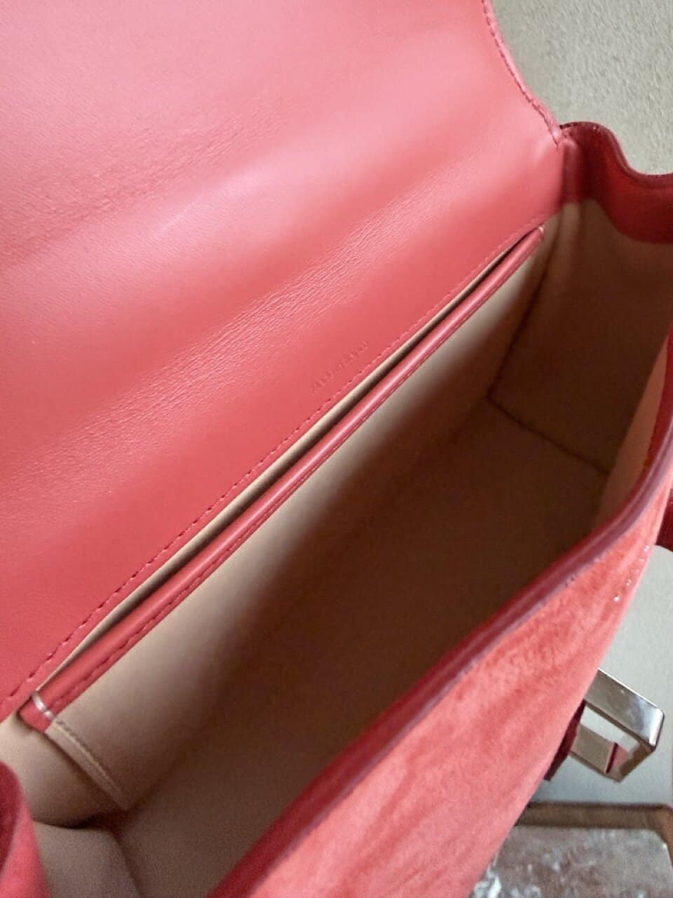 Het interieur is uitgevoerd in nude calf en is zo zacht dat je het bijna niet voelt. Binnenin is er een extra steekzakje naast het grote compartiment. Je draagt hem over de schouder of als crossbody (hij valt lang). Of je lust hem door en draagt hem aan de hand.
