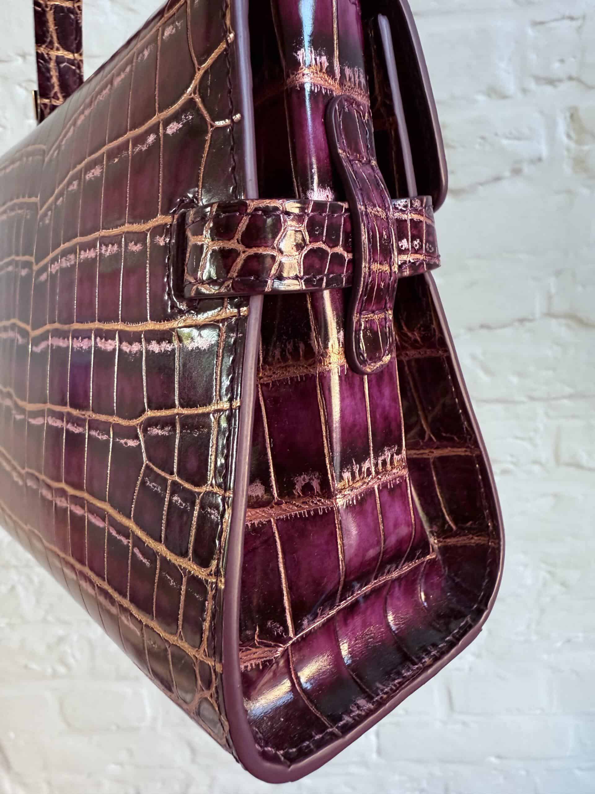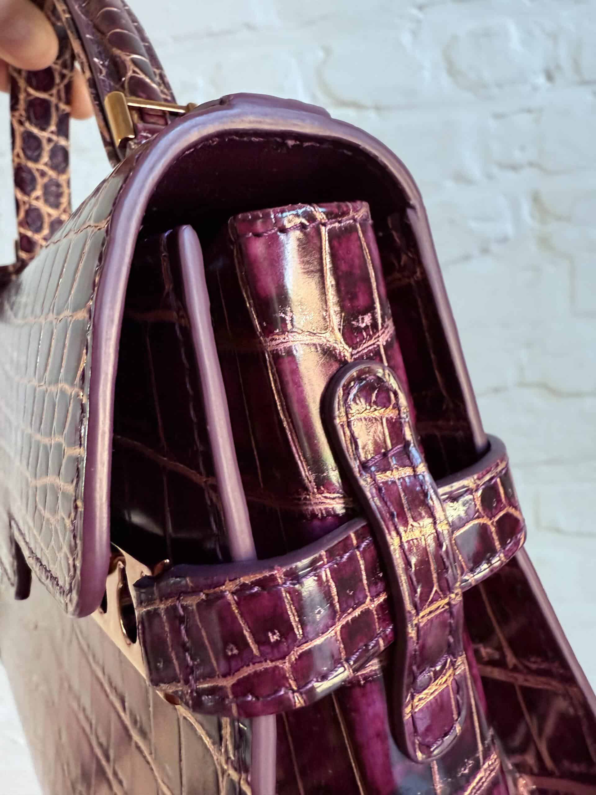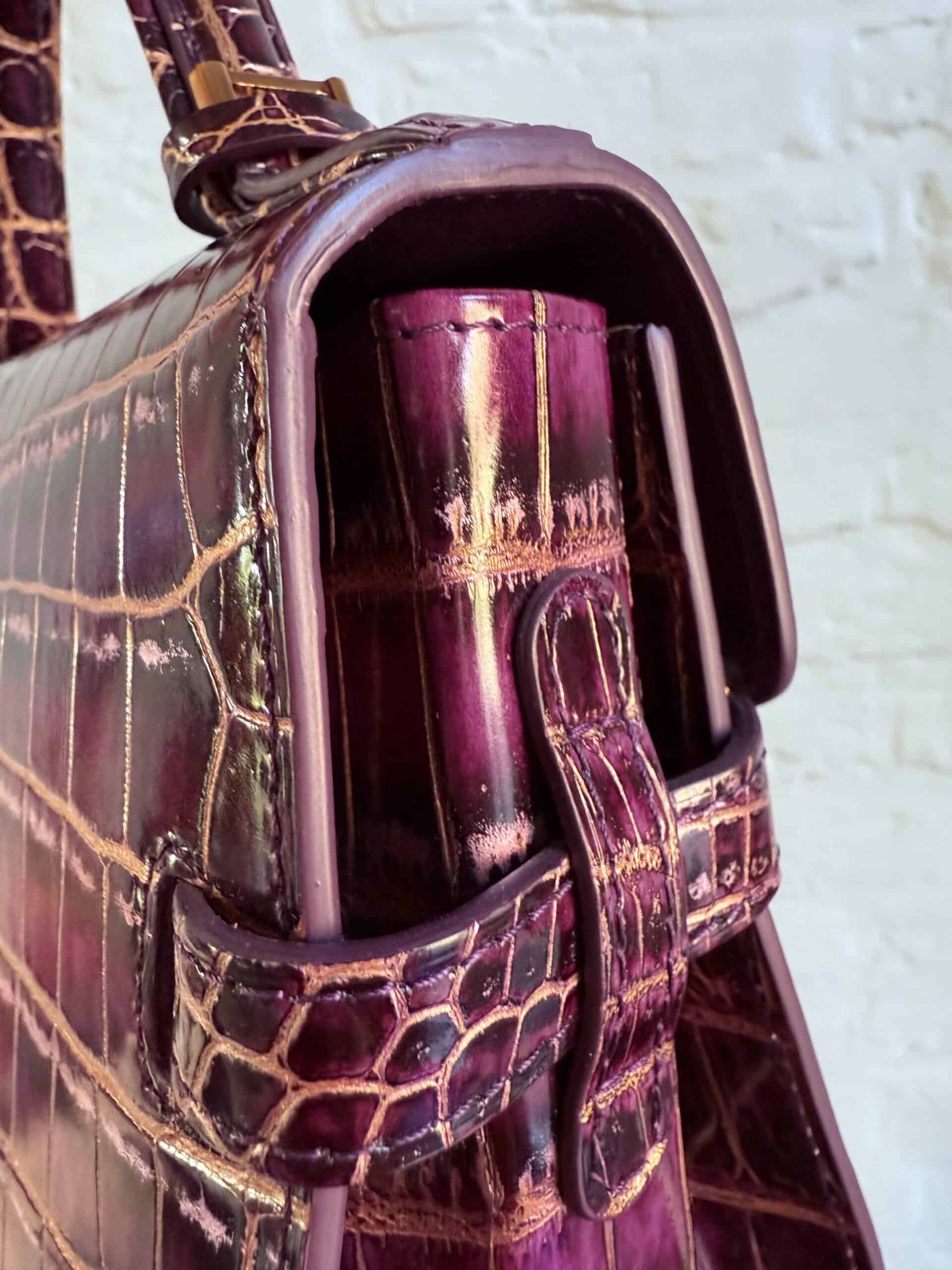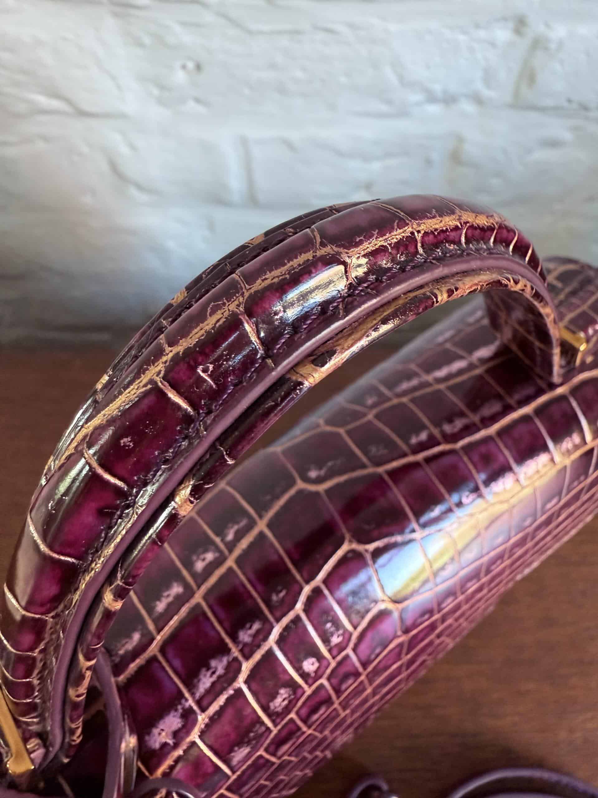 Deze Tempête Mini is heel bijzonder. Uitgevoerd in matte Porosus Crocodile en nabewerkt met goudkleuring en gepolijst.