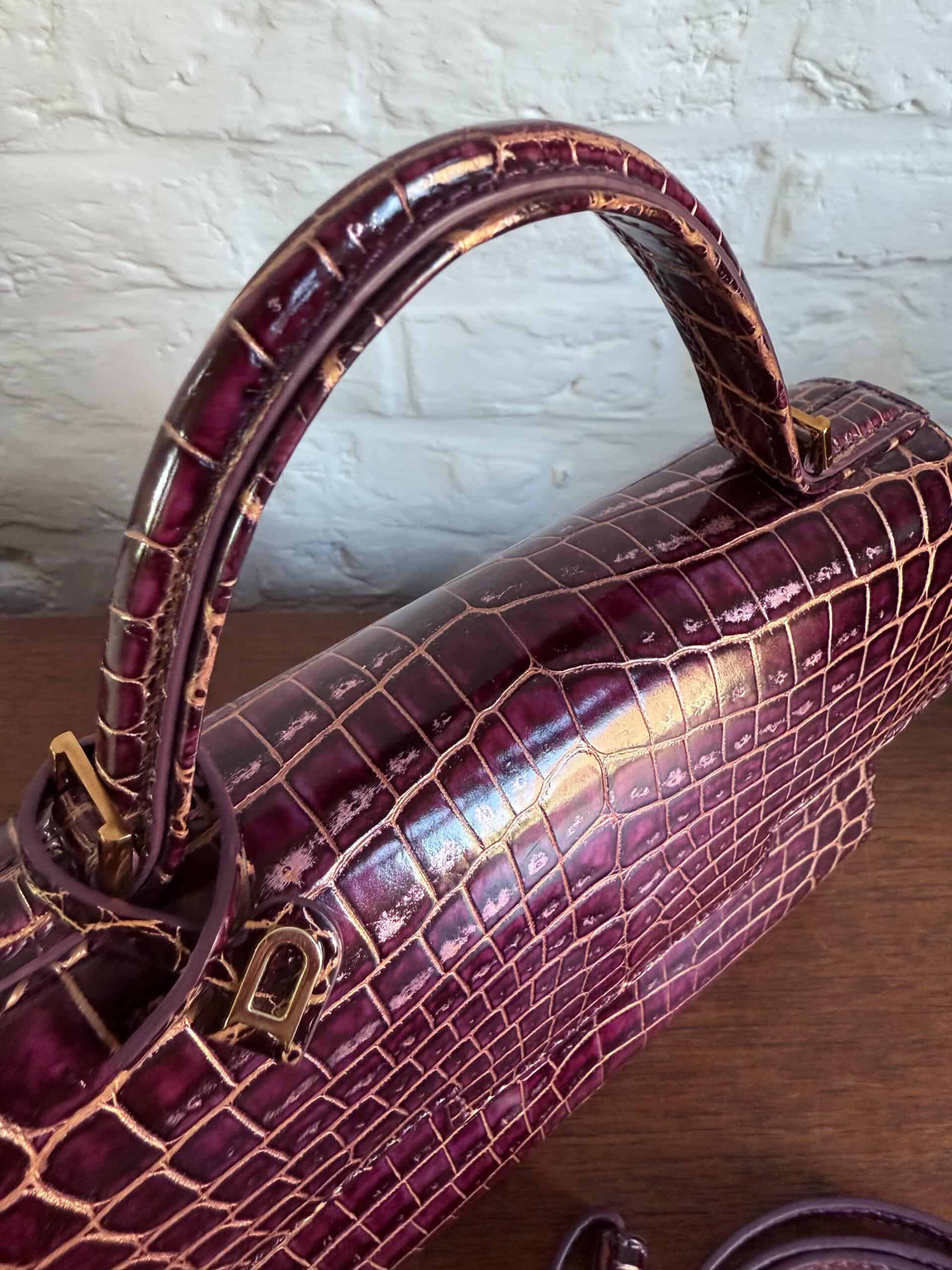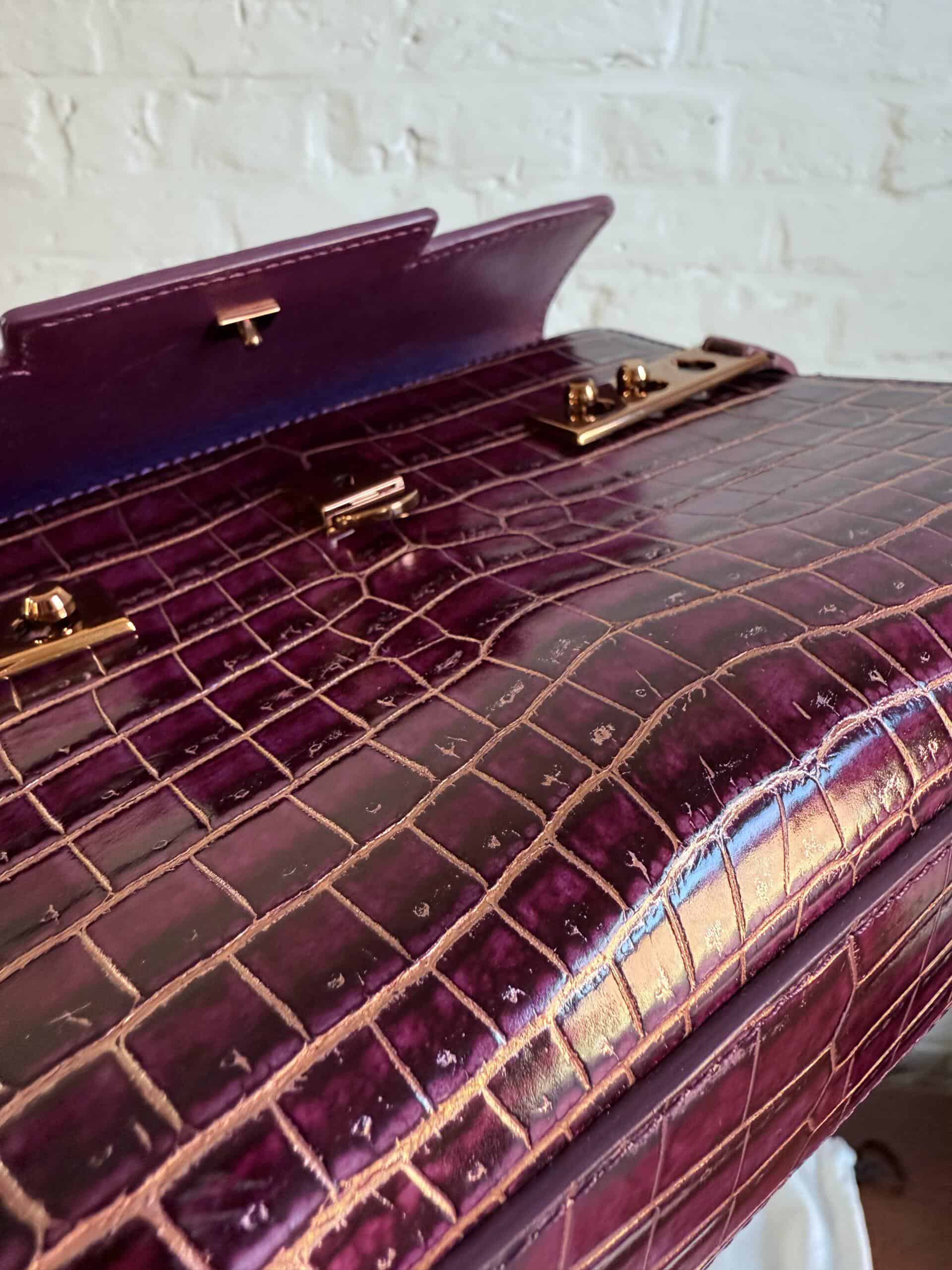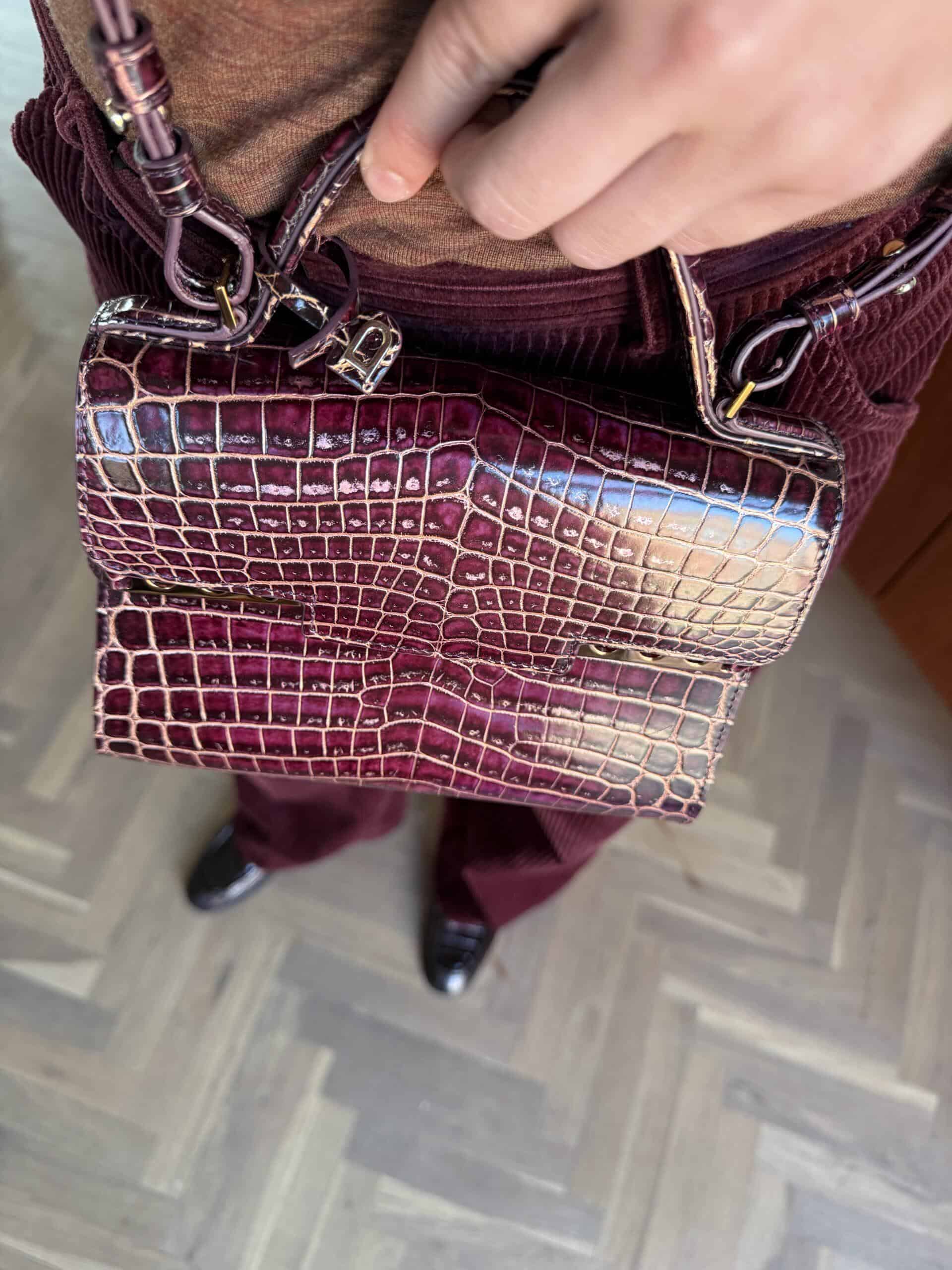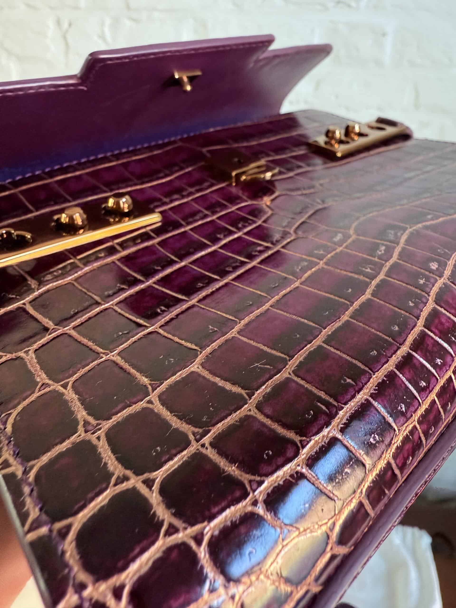 Deze Tempête Mini is heel bijzonder. Uitgevoerd in matte Porosus Crocodile en nabewerkt met goudkleuring en gepolijst.
