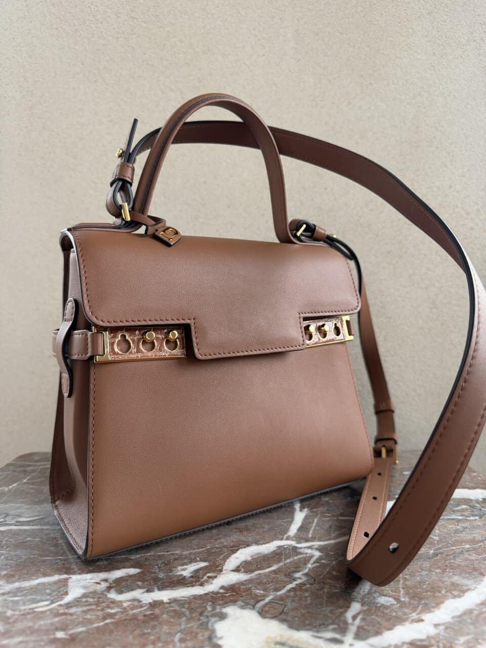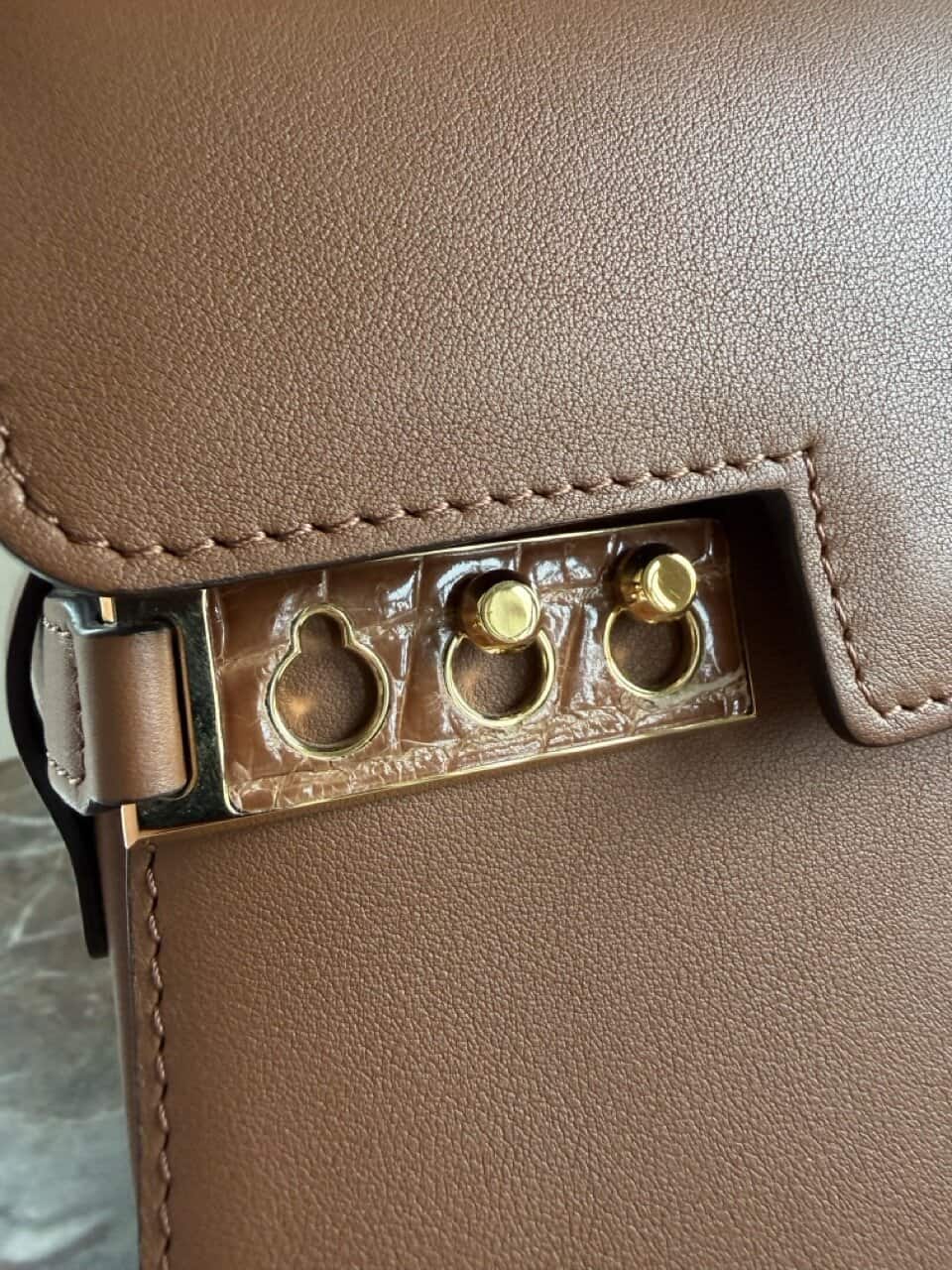 De riem is te verwijderen en verstellen met de gesp. Hij is uitgevoerd in Tan Calf Souple en porosus krokodil op de hardware. Het zachte leder in combinatie met de ingelegde exoot is ongezien mooi.