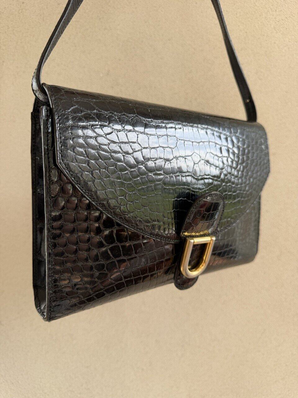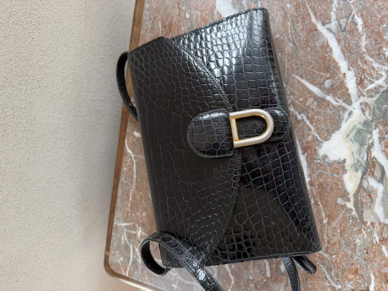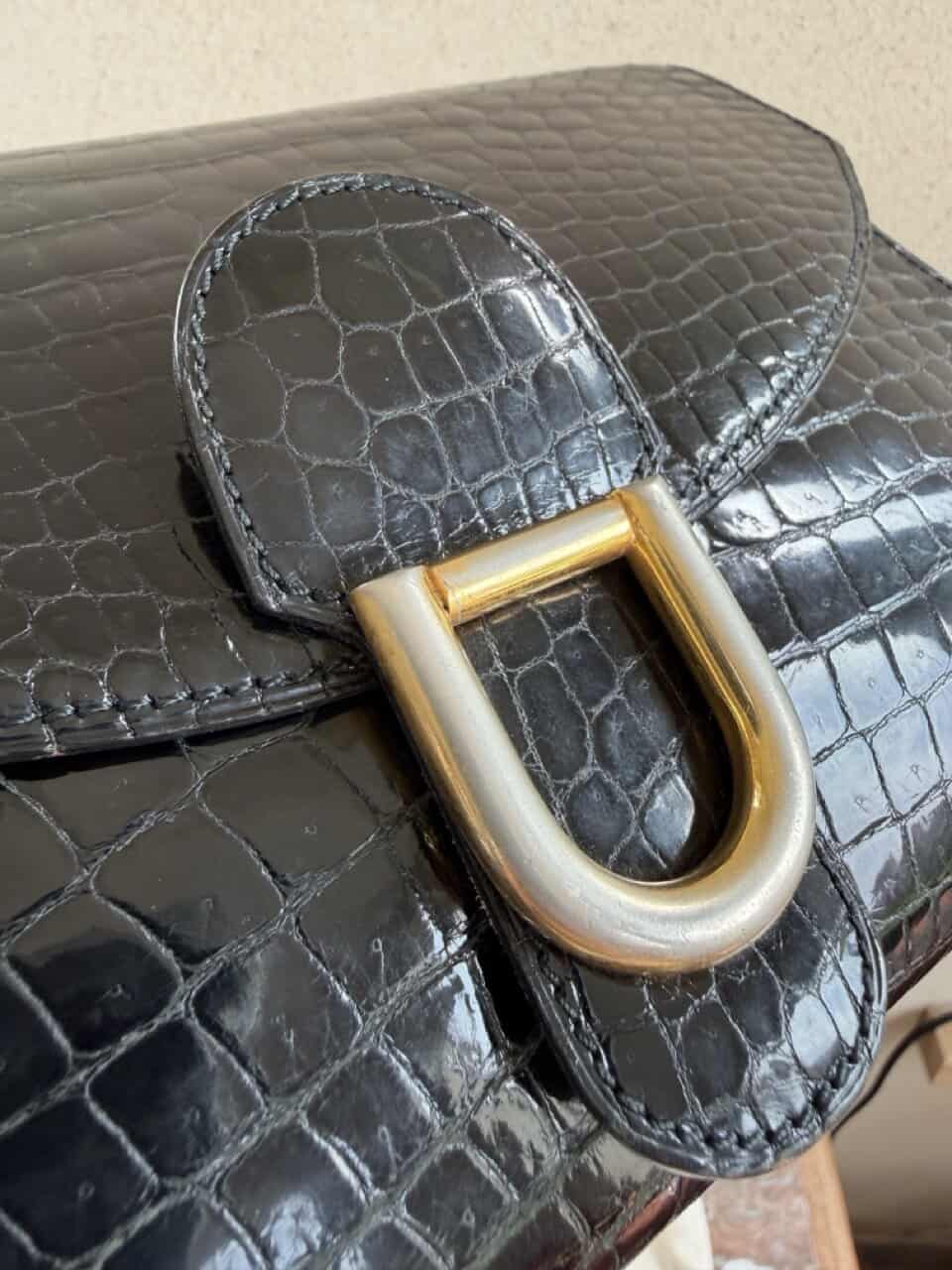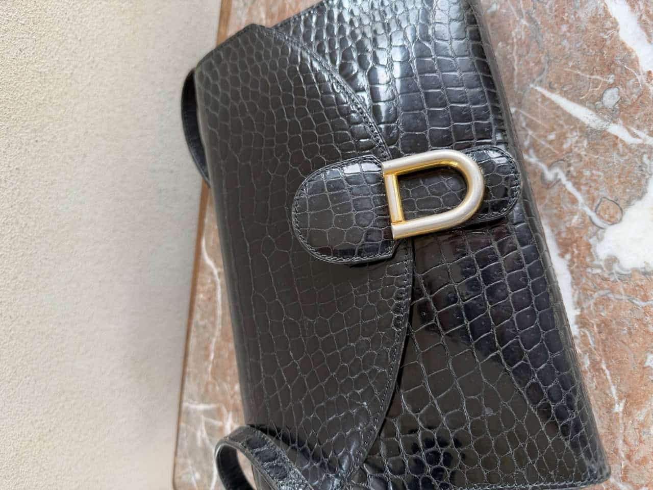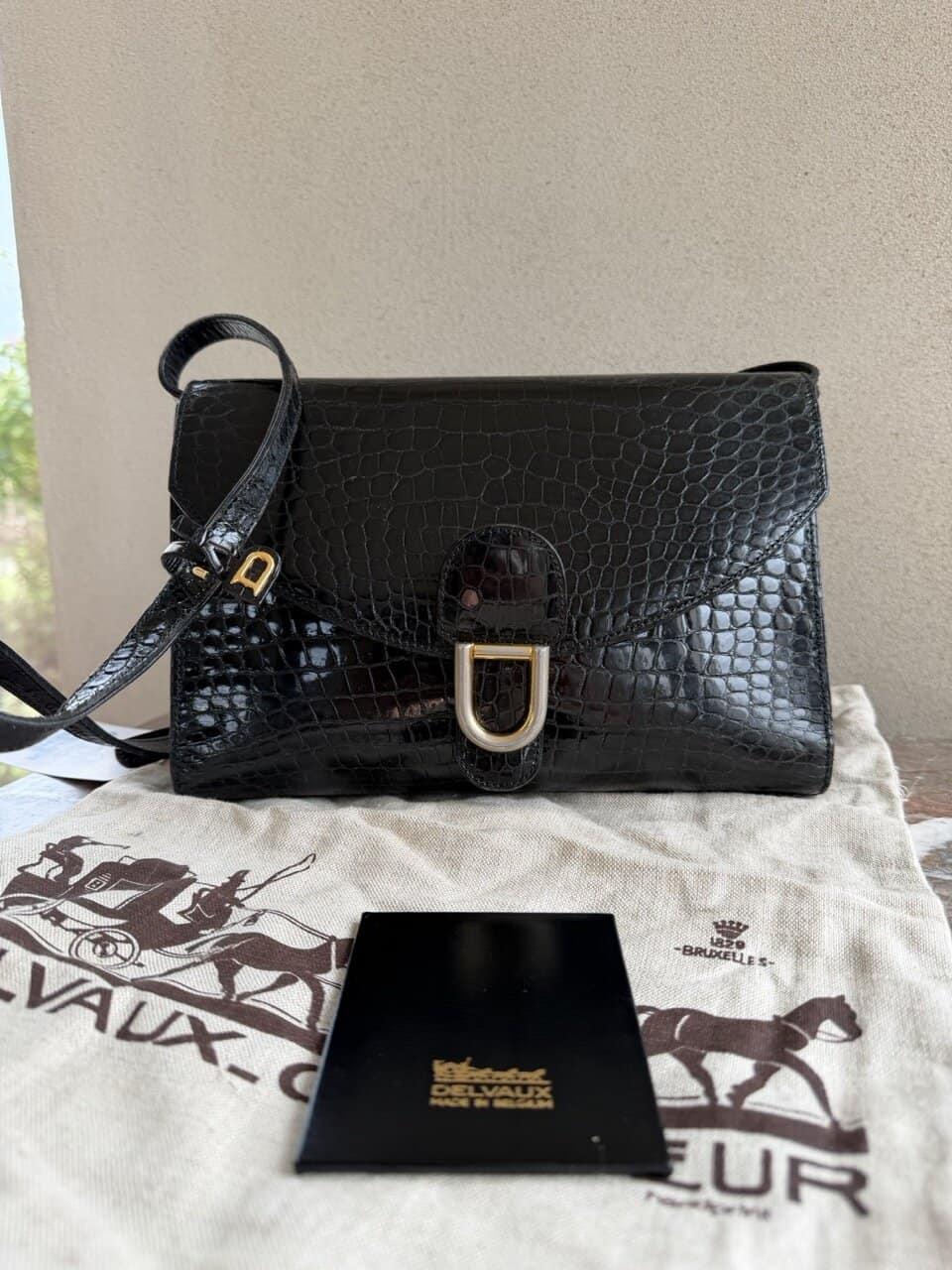 Een prachtige Delvaux in zwarte krokodillenhuid, gekenmerkt door het goudkleurige embleem vooraan op de sluiting.