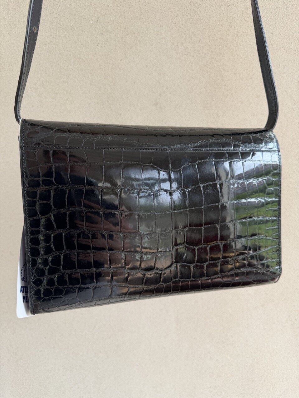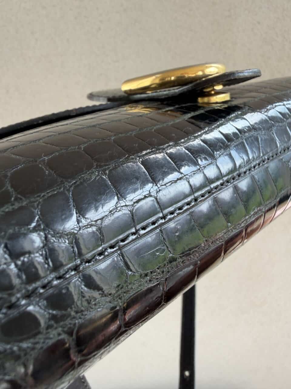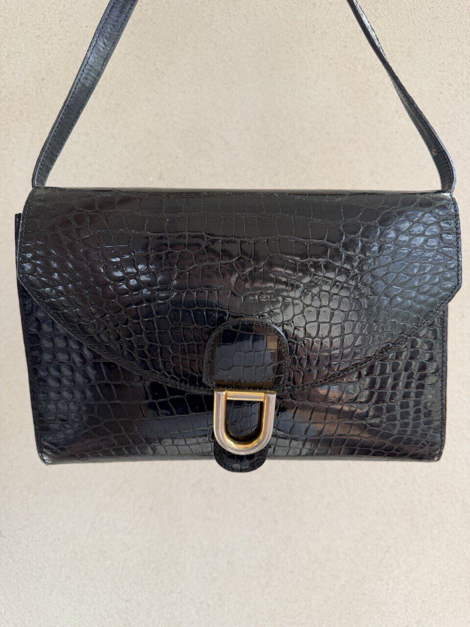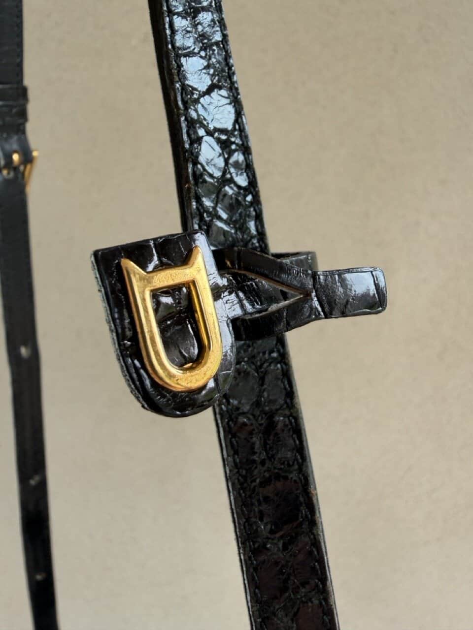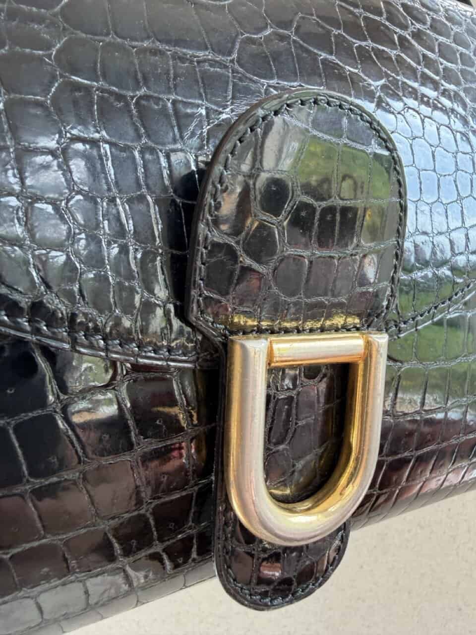 Een prachtige Delvaux in zwarte krokodillenhuid, gekenmerkt door het goudkleurige embleem vooraan op de sluiting.