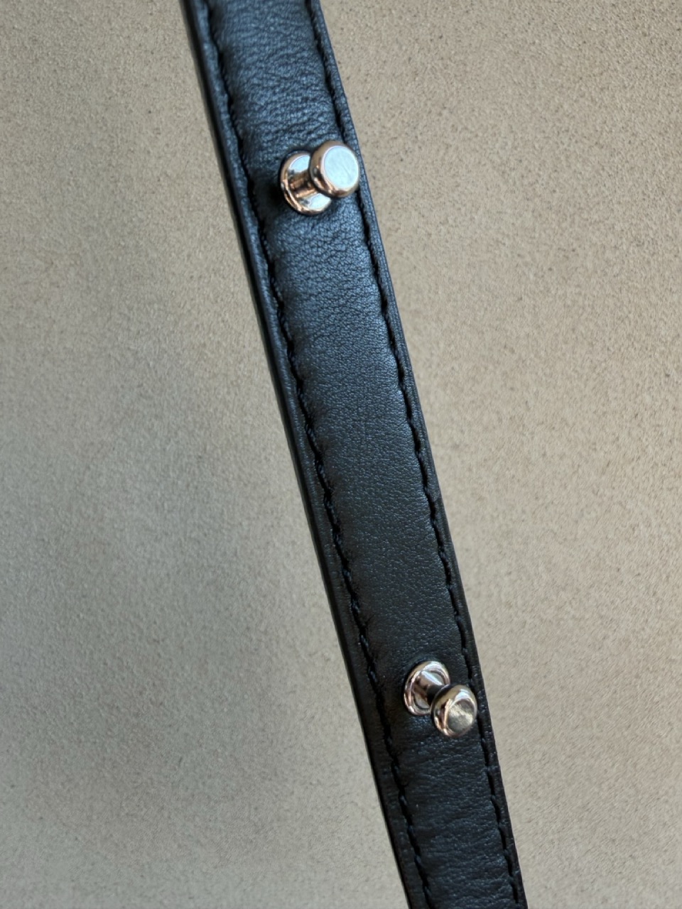 De riem is verstelbaar met geweerknopjes.